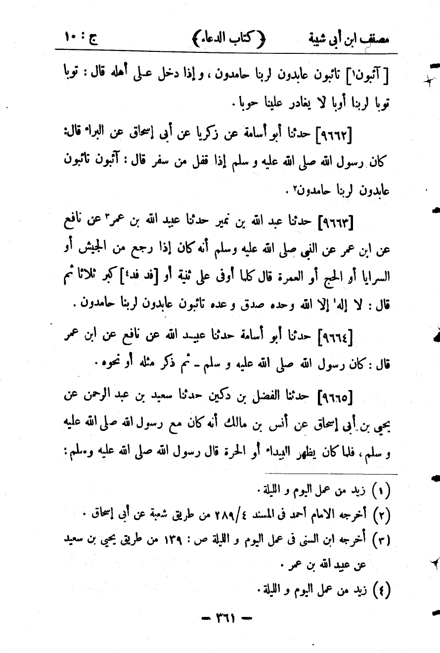 30229- حَدَّثَنَا أَبُو أُسَامَةَ ، عَن زَكَرِيَّا ، عَنْ أَبِي إِسْحَاقَ ، عَنِ الْبَرَاءِ ، قَالَ : كَانَ رَسُولُ اللهِ صلى الله عليه وسلم إذَا قَفَلَ مِنْ سَفَرٍ ، قَالَ : آيِبُونَ تَائِبُونَ عَابِدُونَ لِرَبِّنَا حَامِدُونَ.