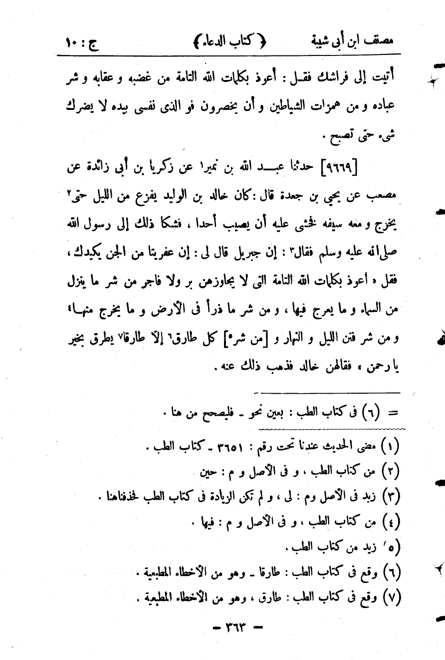30236- حَدَّثَنَا عَبْدُ اللهِ بْنُ نُمَيْرٍ ، عَن زَكَرِيَّا بْنِ أَبِي زَائِدَةَ ، عَن مُصْعَبٍ ، عَن يَحْيَى بْنِ جَعْدَةَ ، قَالَ : كَانَ خَالِدُ بْنُ الْوَلِيدِ يَفْزَعُ مِنَ اللَّيْلِ حَتَّى يَخْرُجَ ، وَمَعَهُ سَيْفُهُ فَخُشِيَ عَلَيْهِ أَنْ يُصِيبَ أَحَدًا ، فَشَكَا ذَلِكَ إِلَى رَسُولِ اللهِ صلى الله عليه وسلم فَقَالَ : إنَّ جِبْرِيلَ ، قَالَ لِي : إنَّ عِفْرِيتًا مِنَ الْجِنِّ يَكِيدُك ، فَقُلْ أَعُوذُ بِكَلِمَاتِ اللهِ التَّامَّةِ الَّتِي لاَ يُجَاوِزُهُنَّ بَرٌّ ، وَلا فَاجِرٌ , مِنْ شَرِّ مَا يَنْزِلُ مِنَ السَّمَاءِ ، وَمَا يَعْرُجُ فِيهَا ، وَمِنْ شَرِّ مَا ذَرَأَ فِي الأَرْضِ ، وَمَا يَخْرُجُ مِنْهَا , وَشَرِّ فِتَنِ اللَّيْلِ وَالنَّهَارِ , وَكُلِّ طَارِقٍ إِلاَّ طَارِقًا يَطْرُقُ بِخَيْرٍ يَا رَحْمَنُ فَقَالَهُنَّ خَالِدٌ فَذَهَبَ ذَلِكَ عَنْهُ.