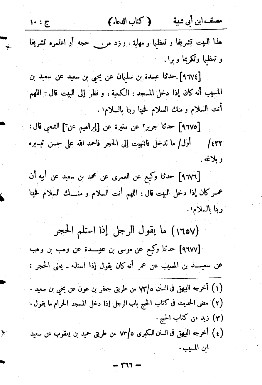 30241- حَدَّثَنَا عَبْدَةُ بْنُ سُلَيْمَانَ ، عَن يَحْيَى بْنِ سَعِيدٍ ، عَنْ مُحَمَّدِ بْنِ سَعِيدٍ ، عَن سَعِيدِ بْنِ الْمُسَيَّبِ ، أَنَّهُ كَانَ إذَا دَخَلَ مَسْجِدَ الْكَعْبَةَ ، وَنَظَرَ إِلَى الْبَيْتِ ، قَالَ : اللَّهُمَّ أَنْتَ السَّلامُ وَمِنْك السَّلامُ فَحَيِّنَا رَبَّنَا بِالسَّلامِ.