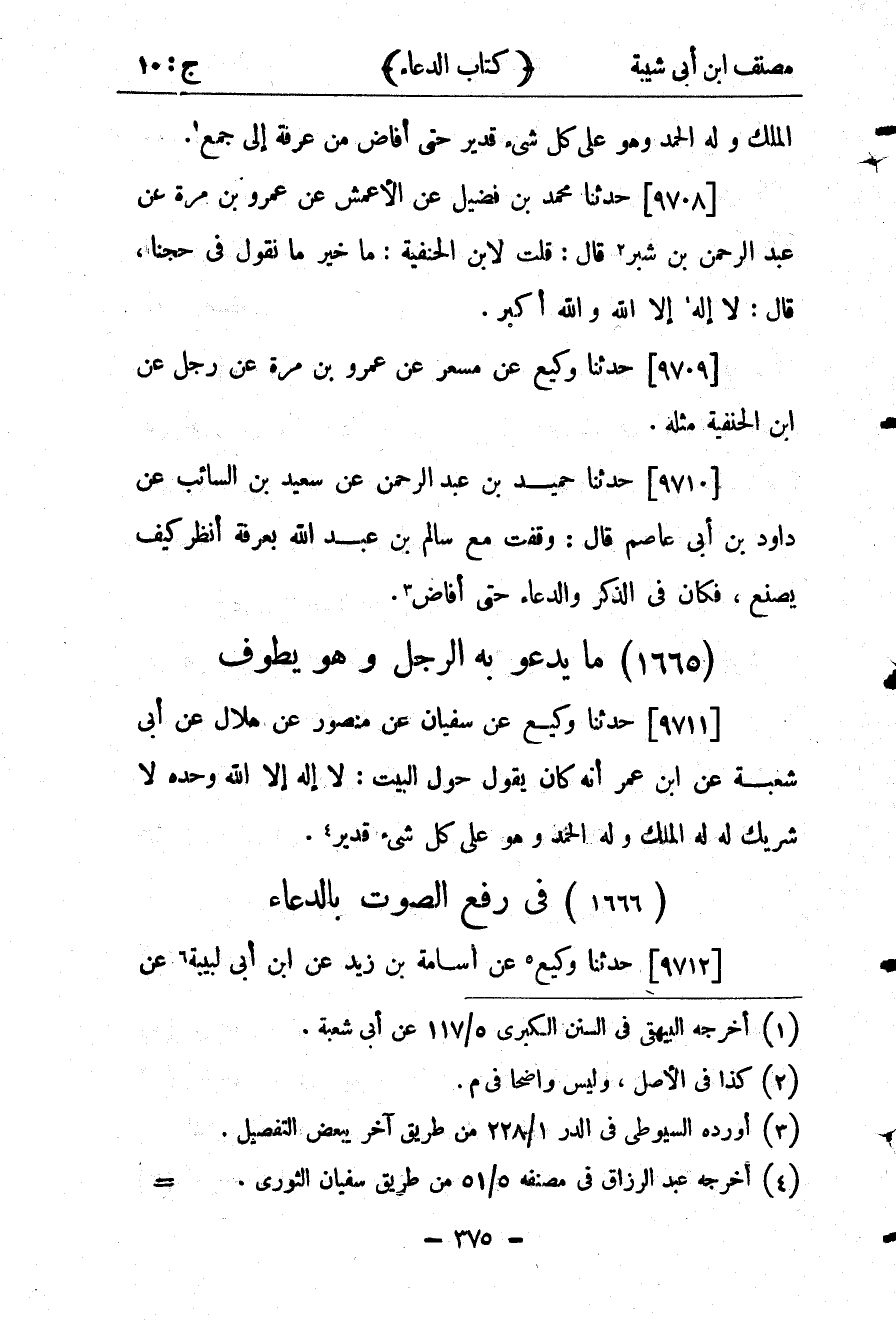 30278- حَدَّثَنَا وَكِيعٌ ، عَن سُفْيَانَ ، عَن مَنْصُورٍ ، عَن هِلالٍ ، عَنْ أَبِي شُعْبَةَ ، عَنِ ابْنِ عُمَرَ ، أَنَّهُ كَانَ يَقُولُ حَوْلَ الْبَيْتِ : لاَ إلَهَ إِلاَّ اللَّهُ وَحْدَهُ لاَ شَرِيكَ لَهُ لَهُ الْمُلْكُ وَلَهُ الْحَمْدُ وَهُوَ عَلَى كُلِّ شَيْءٍ قَدِيرٌ.