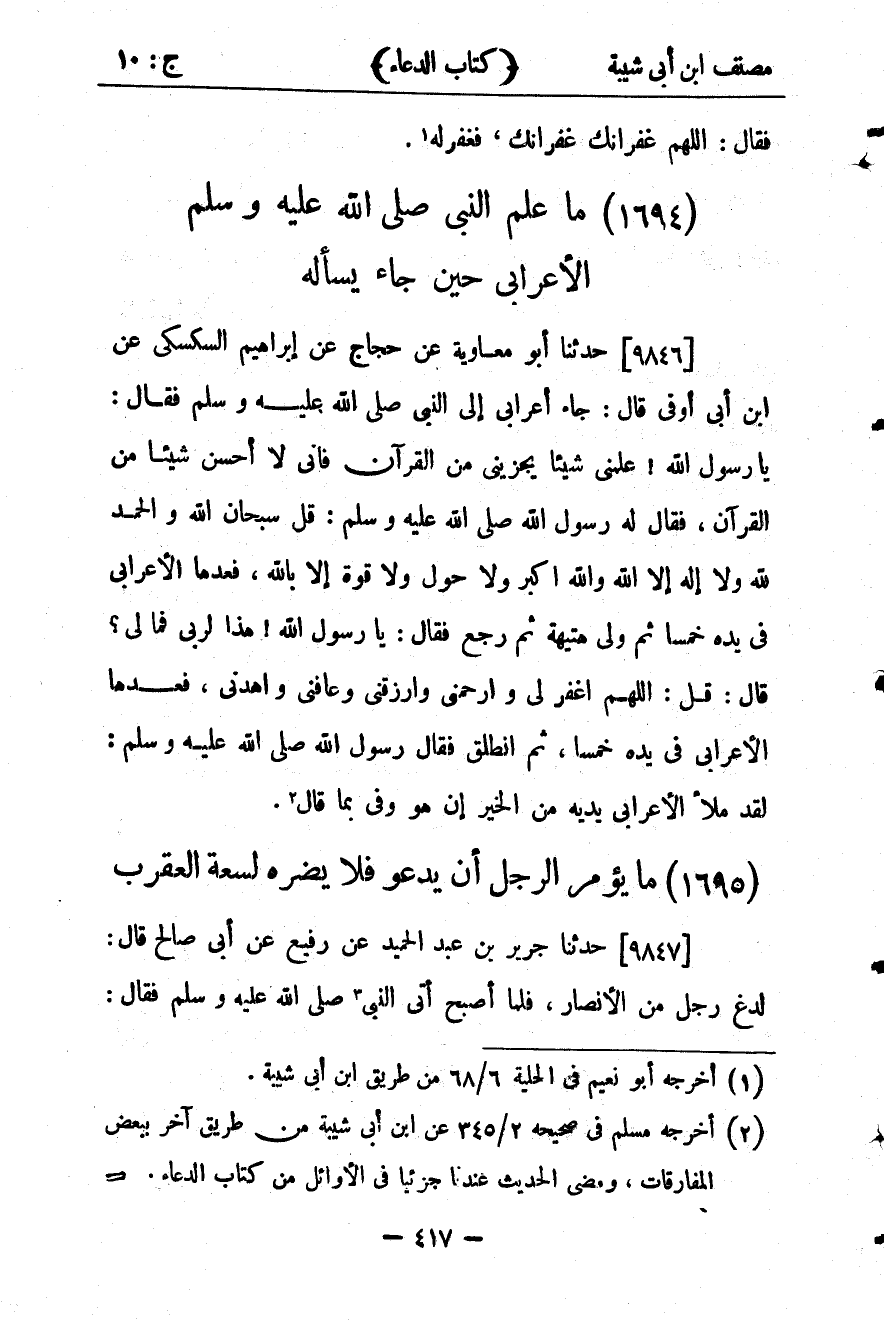 30416- حَدَّثَنَا أَبُو مُعَاوِيَةَ ، عَن حَجَّاجٍ ، عَنْ إبْرَاهِيمَ السَّكْسَكِيِّ ، عَنِ ابْنِ أَبِي أَوْفَى ، قَالَ : جَاءَ أَعْرَابِيٌّ إِلَى النَّبِيُّ صلى الله عليه وسلم فَقَالَ : يَا رَسُولَ اللهِ ، عَلِّمْنِي شَيْئًا يُجْزِينِي مِنَ الْقُرْآنِ فَإِنِّي لاَ أُحْسِنُ شَيْئًا مِنَ الْقُرْآنِ ، فَقَالَ لَهُ رَسُولُ صلى الله عليه وسلم : قُلْ سُبْحَانَ اللهِ وَالْحَمْدُ لِلَّهِ ، وَلا إلَهَ إِلاَّ اللَّهُ ، وَاللَّهُ أَكْبَرُ ، وَلا حَوْلَ وَلا قُوَّةَ إِلاَّ بِاللهِ ، فَعَدَّهَا الأَعْرَابِيُّ فِي يَدِهِ خَمْسًا ، ثُمَّ وَلَّى هُنَيْهَةً ، ثُمَّ رَجَعَ فَقَالَ : يَا رَسُولَ اللهِ ، هَذَا لِرَبِّي فَمَا لِي ؟ قَالَ : قُلِ : اللَّهُمَّ اغْفِرْ لِي وَارْحَمْنِي وارزقني وَعَافَنِي وَاهْدِنِي ، فَعَدَّهَا الأَعْرَابِيُّ فِي يَدِهِ خَمْسًا ، ثُمَّ انْطَلَقَ فَقَالَ رَسُولُ اللهِ صلى الله عليه وسلم : لَقَدْ مَلأَ الأَعْرَابِيُّ يَدَيْهِ مِنَ الْخَيْرِ إِنْ هُوَ وَفَّى بِمَا قَالَ.