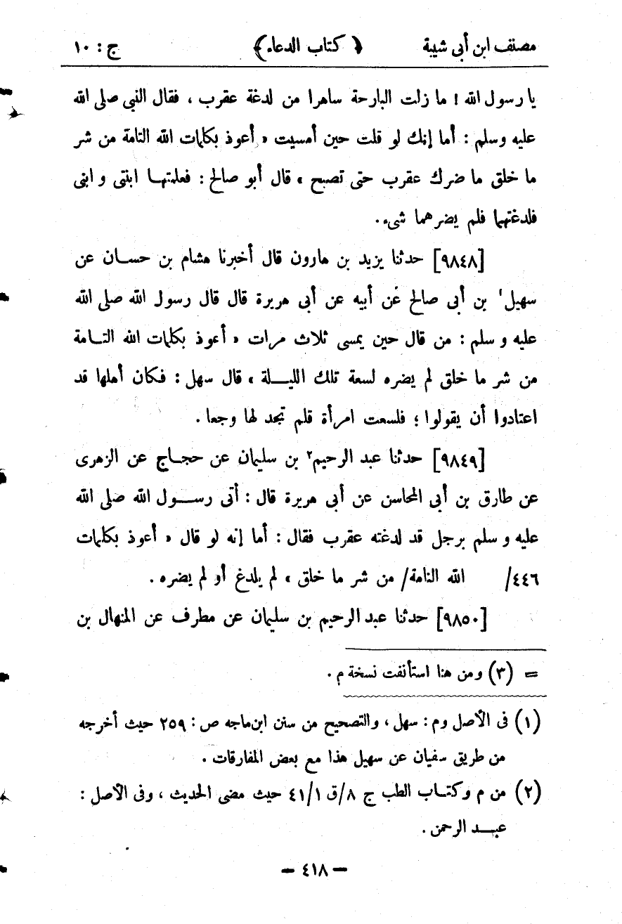 30419- حَدَّثَنَا عَبْدُ الرحمن بْنُ سُلَيْمَانَ ، عَن حَجَّاجٍ ، عَنِ الزُّهْرِيِّ ، عَن طَارِقِ بْنِ أَبِي مخَاشِنِ ، عَنْ أَبِي هُرَيْرَةَ ، قَالَ : أُتِيَ رَسُولُ اللهِ صلى الله عليه وسلم بِرَجُلٍ قَدْ لَدَغَتْهُ عَقْرَبٌ ، فَقَالَ : أَمَا إِنَّهُ لَوْ قَالَ أَعُوذُ بِكَلِمَاتِ اللهِ التَّامَّةِ مِنْ شَرِّ مَا خَلَقَ لَمْ يُلْدَغْ ، أَوْ لَمْ يَضُرَّهُ.