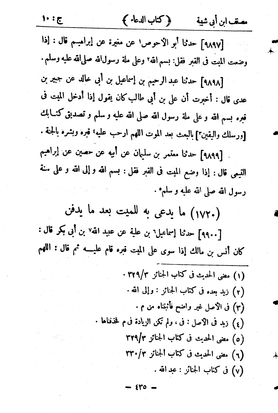 30471- حَدَّثَنَا إسْمَاعِيلُ ابْنُ عُلَيَّةَ ، عَن عبد اللهِ بْنِ أَبِي بَكْرٍ ، قَالَ : كَانَ أَنَسُ بْنُ مَالِكٍ إذَا سُوِّيَ عَلَى الْمَيِّتِ قَبْرُهُ قَامَ عَلَيْهِ , ثُمَّ قَالَ : اللَّهُمَّ عَبْدُك رُدَّ عَلَيْك , فَارْأَفْ بِهِ وَارْحَمْهُ ، اللَّهُمَّ جَافِ الأَرْضَ عَنْ جَنْبَيْهِ وَافْتَحْ أَبْوَابَ السَّمَاءِ لِرُوحِهِ , وَتَقَبَّلْهُ مِنْك بِقَبُولٍ حَسَنٍ ، اللَّهُمَّ إِنْ كَانَ مُحْسِنًا فَضَاعِفْ لَهُ فِي إحْسَانِهِ ، وَإِنْ كَانَ مُسِيئًا فَتَجَاوَزْ عَن سَيِّئَاتِهِ.