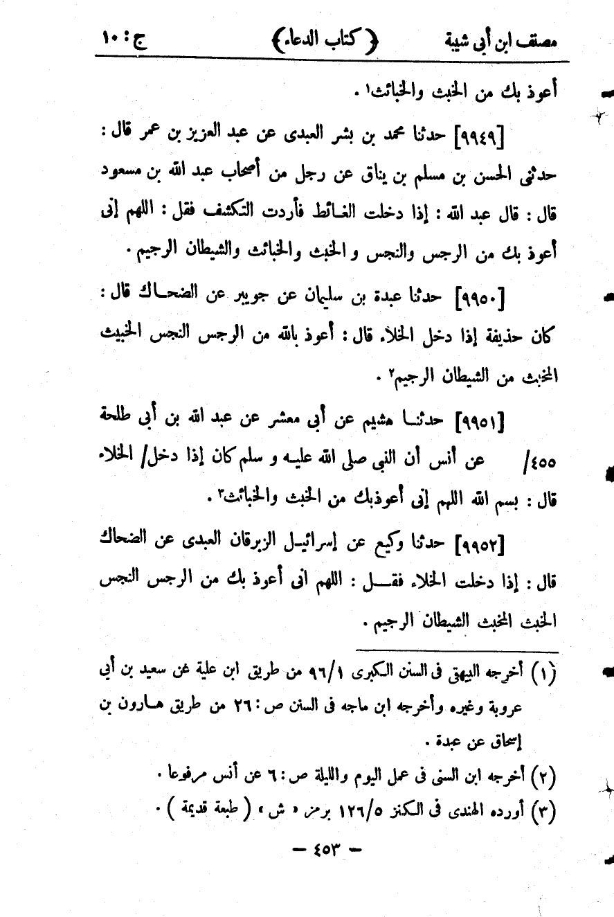 30521- حَدَّثَنَا عَبْدَةُ بْنُ سُلَيْمَانَ ، عَن جُوَيْبِرٍ ، عَنِ الضِّحَاكِ ، قَالَ : كَانَ حُذَيْفَةُ إذَا دَخَلَ الْخَلاءَ ، قَالَ : أَعُوذُ بِاللهِ مِنَ الشَّيْطَانِ الرَّجِيمِ الرِّجْسِ النَّجَسِ الْخَبِيثِ الْمُخَبَّثِ الشَّيْطَانِ الرَّجِيمِ.