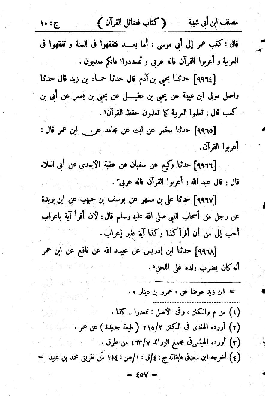 30535- حَدَّثَنَا يَحْيَى بْنُ آدَمَ ، قَالَ : حدَّثَنَا حَمَّادُ بْنُ زَيْدٍ ، قَالَ : حَدَّثَنَا وَاصِلٌ مَوْلَى أَبِي عُيَيْنَةَ ، عَن يَحْيَى بْنِ عَقِيلٍ ، عَن يَحْيَى بْنِ يَعْمَُرَ ، عَن أُبَيِّ بْنِ كَعْبٍ ، قَالَ : تَعَلَّمُوا الْعَرَبِيَّةَ كَمَا تَعَلَّمُونَ حِفْظَ الْقُرْآنِ.