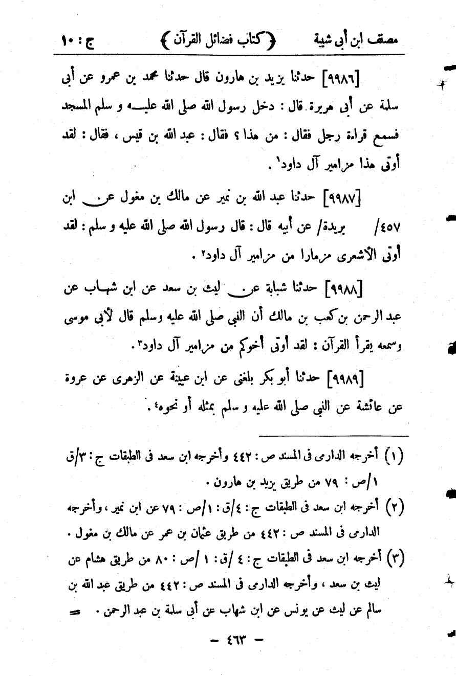 30557- حَدَّثَنَا يَزِيدُ بْنُ هَارُونَ ، قَالَ : حدَّثَنَا مُحَمَّدُ بْنُ عَمْرٍو ، عَنْ أَبِي سَلَمَةَ ، عَنْ أَبِي هُرَيْرَةَ ، قَالَ : دَخَلَ رَسُولُ اللهِ صلى الله عليه وسلم الْمَسْجِدَ فَسَمِعَ قِرَاءَةَ رَجُلٍ فَقَالَ : مَنْ هَذَا ؟ فقيل عَبْدُ اللهِ بْنُ قَيْسٍ ، فَقَالَ : لَقَدْ أُوتِيَ هَذَا مِنْ مَزَامِير آلِ دَاوُد.