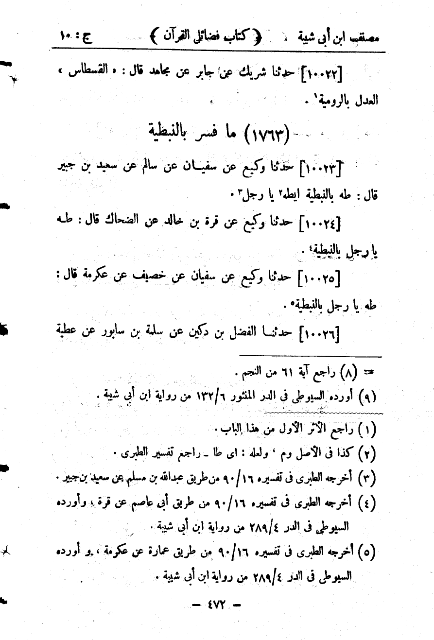 30597- حَدَّثَنَا وَكِيعٌ ، عَن قُرَّةَ بْنِ خَالِدٍ ، عَنِ الضَّحَّاك ، قَالَ : {طَه} يَا رَجُلُ بِالنَّبَطِيَّةِ.