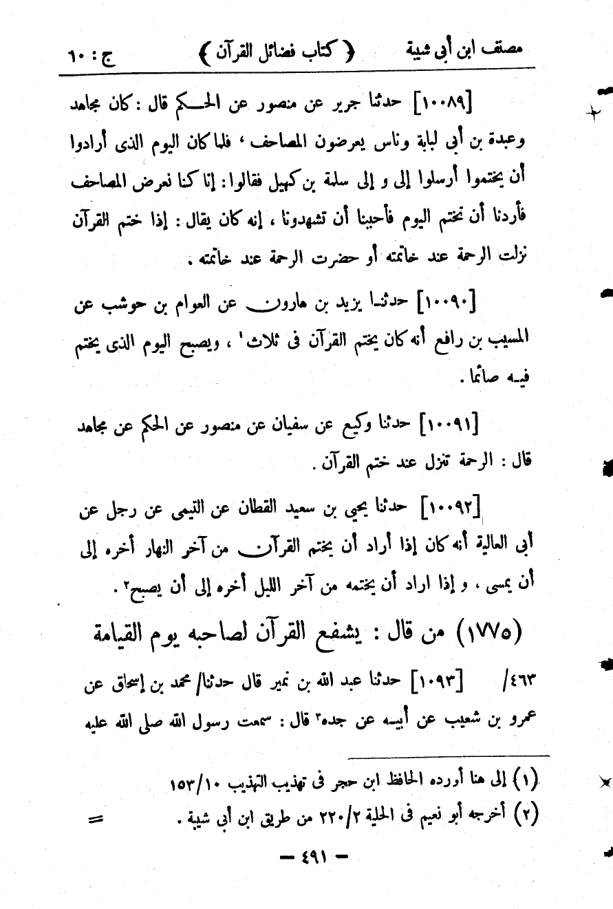 30663- حَدَّثَنَا جَرِيرٌ ، عَن مَنْصُورٍ ، عَنِ الْحَكَمِ ، قَالَ : كَانَ مُجَاهِدٌ ، وَعَبْدَةُ بْنُ أَبِي لُبَابَةَ وَنَاسٌ يَعْرِضُونَ الْمَصَاحِفَ ، فَلَمَّا كَانَ الْيَوْمُ الَّذِي أَرَادُوا أَنْ يَخْتِمُوا أَرْسَلُوا إلَيَّ وَإِلَى سَلَمَةَ بْنِ كُهَيْلٍ فَقَالُوا : إنَّا كُنَّا نَعْرِضُ الْمَصَاحِفَ فَأَرَدْنَا أَنْ نَخْتِمَ الْيَوْمَ فَأَحْبَبْنَا أَنْ تَشْهَدُونَا ، إِنَّهُ كَانَ يُقَالُ : إذَا خُتِمَ الْقُرْآنُ نَزَلَتِ الرَّحْمَةُ عِنْدَ خَاتِمَتِهِ ، أَوْ حَضَرَتِ الرَّحْمَةُ عِنْدَ خَاتِمَتِهِ.