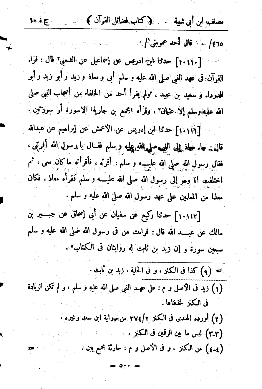 30684- حَدَّثَنَا ابْنُ إدْرِيسَ ، عَنْ إسْمَاعِيلَ ، عَنِ الشَّعْبِيِّ ، قَالَ : قَرَؤُوا الْقُرْآنِ فِي عَهْدِ النَّبِيِّ صلى الله عليه وسلم أُبَيٌّ وَمُعَاذٌ وَزَيْدٌ ، وَأَبُو زَيْدٍ ، وَأَبُو الدَّرْدَاءِ وَسَعِيدُ بْنُ عُبَيْدٍ ، وَلَمْ يَقْرَأْه أَحَدٌ مِنَ الْخُلَفَاءِ مِنْ أَصْحَابِ النَّبِيِّ صلى الله عليه وسلم إِلاَّ عُثْمَانُ ، وَقَرَأَهُ مُجَمِّعُ ابْنُ جَارِيَةَ إِلاَّ سُورَةً ، أَوْ سُورَتَيْنِ.