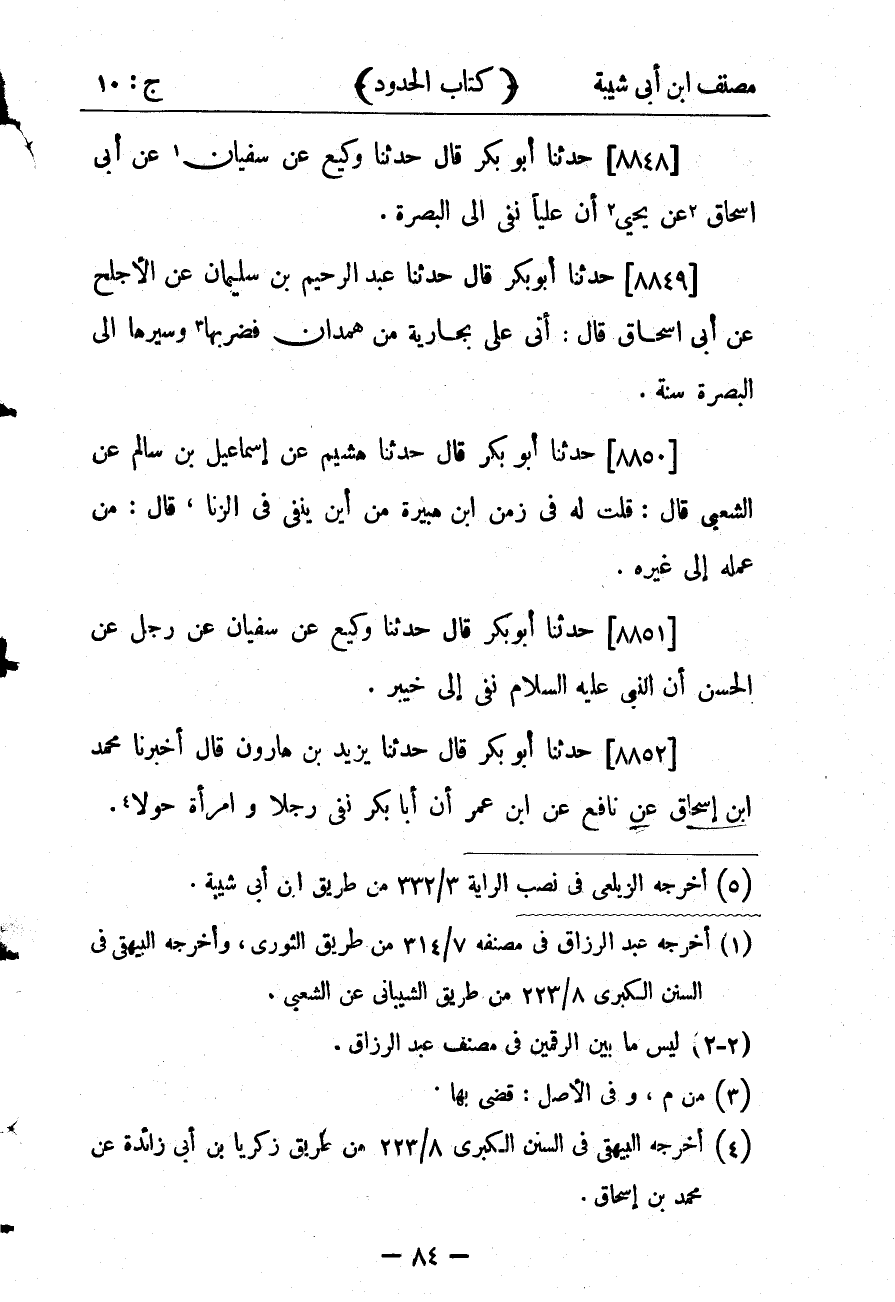 29395- حَدَّثَنَا وَكِيعٌ ، عَنْ سُفْيَانَ ، عَنْ أَبِي إِسْحَاقَ ، عَنْ الْحَيِّ ؛ أَنَّ عَلِيًّا نَفَى إِلَى الْبَصْرَةِ.
