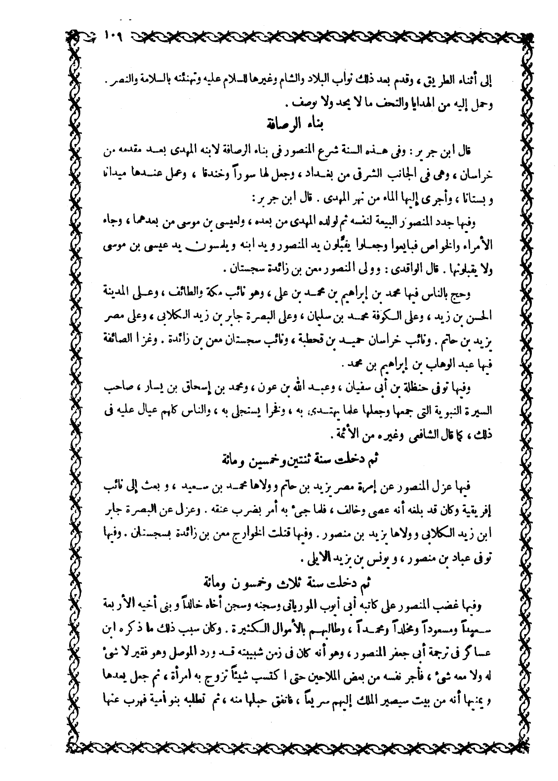 قَالَ ابْنُ جَرِيرٍ: وَفِي هَذِهِ السنة شَرَعَ الْمَنْصُورُ فِي بِنَاءِ الرُّصَافَةِ لِابْنِهِ الْمَهْدِيِّ بعد مقدمه من خراسان، وهي فِي الْجَانِبِ الشَّرْقِيِّ مِنْ بَغْدَادَ، وَجَعَلَ لَهَا سُورًا وَخَنْدَقًا، وَعَمِلَ عِنْدَهَا مَيْدَانًا وَبُسْتَانًا، وَأَجْرَى إِلَيْهَا الْمَاءَ مِنْ نَهْرِ الْمَهْدِيِّ. قَالَ ابْنُ جرير: