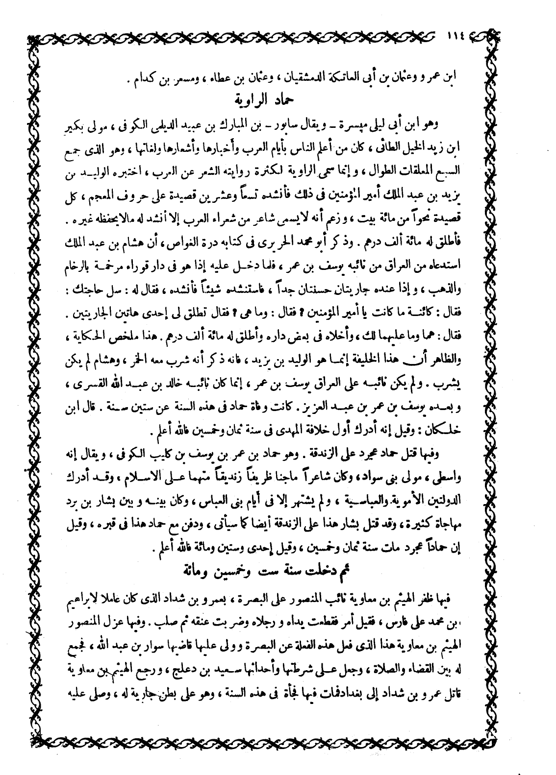فَقَالَ: هُمَا وما عليهما لك، وأخلاه في بعض داره وأطلق له مائة أَلْفَ دِرْهَمٍ. هَذَا مُلَخَّصُ الْحِكَايَةِ، وَالظَّاهِرُ أَنَّ هَذَا الْخَلِيفَةَ إِنَّمَا هُوَ الْوَلِيدُ بْنُ يَزِيدَ، فإنه ذكر أنه شرب معه الخمر، وَهِشَامٌ لَمْ يَكُنْ يَشْرَبُ. وَلَمْ يَكُنْ نَائِبَهُ على العراق يوسف بن عمر، إنما كان نائبة خَالِدَ بْنَ عَبْدِ اللَّهِ الْقَسْرِيَّ، وَبَعْدَهُ يُوسُفُ بن عمر بن عبد العزيز. كانت وَفَاةُ حَمَّادٍ فِي هَذِهِ السَّنَةِ عَنْ سِتِّينَ سَنَةً. قَالَ ابْنُ خِلِّكَانَ: وَقِيلَ إِنَّهُ أَدْرَكَ أَوَّلَ خِلَافَةِ الْمَهْدِيِّ فِي سَنَةِ ثَمَانٍ وَخَمْسِينَ فاللَّه أَعْلَمُ.