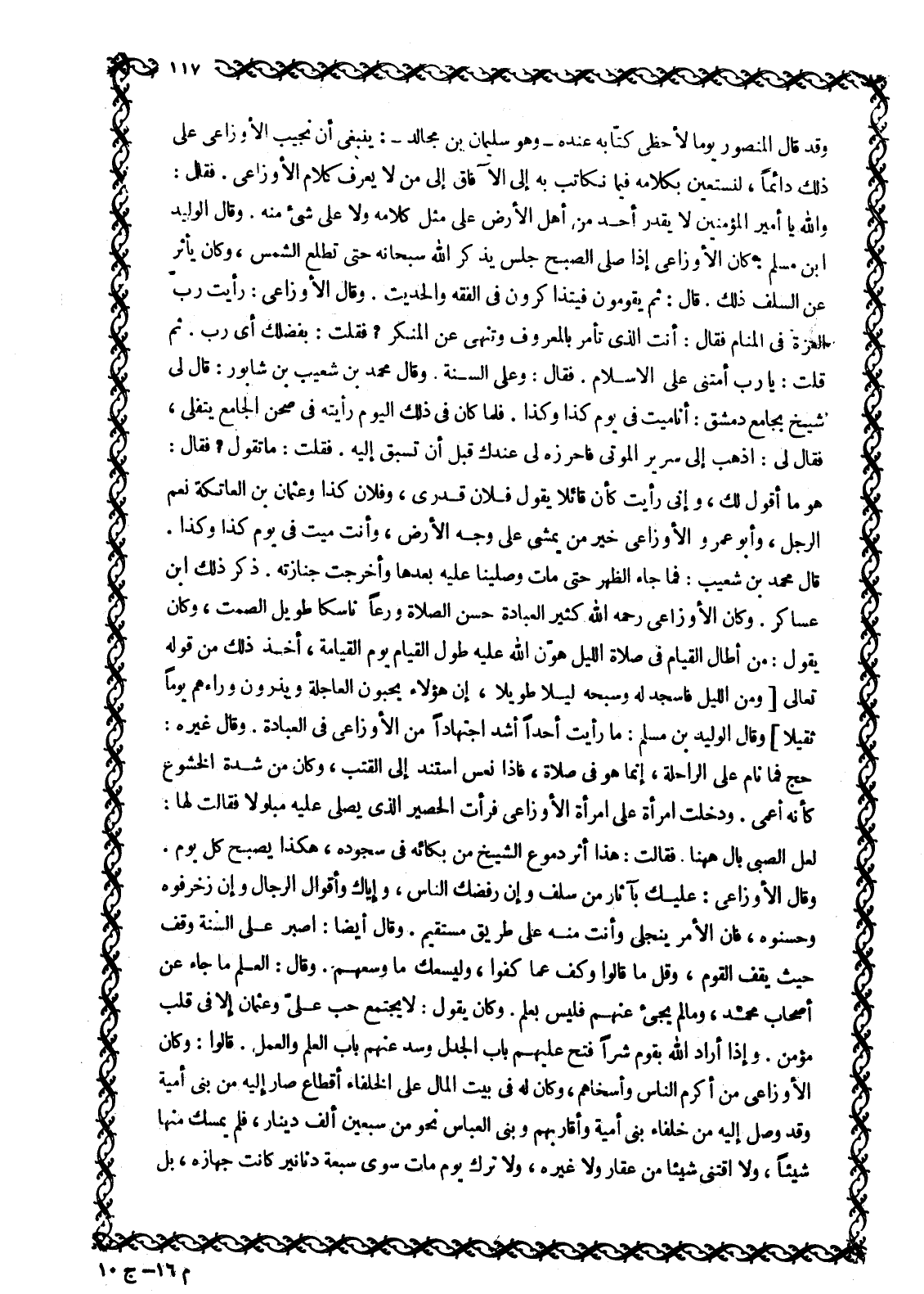 وَاللَّهِ يَا أَمِيرَ الْمُؤْمِنِينَ لَا يَقْدِرُ أحد من أهل الأرض على مثل كلامه ولا على شيء منه. وقال الوليد ابن مُسْلِمٍ: كَانَ الْأَوْزَاعِيُّ إِذَا صَلَّى الصُّبْحَ جَلَسَ يذكر الله سبحانه حتى تطلع الشمس، وكان يأثر عَنِ السَّلَفِ ذَلِكَ. قَالَ: ثُمَّ يَقُومُونَ فَيَتَذَاكَرُونَ في الفقه والحديث. وقال الأوزاعي: رَأَيْتُ رَبَّ الْعِزَّةِ فِي الْمَنَامِ فَقَالَ: أَنْتَ الَّذِي تَأْمُرُ بِالْمَعْرُوفِ وَتَنْهَى عَنِ الْمُنْكَرِ؟ فَقُلْتُ: بفضلك أي رب. ثم قُلْتُ: يَا رَبِّ أَمِتْنِي عَلَى الْإِسْلَامِ. فَقَالَ: وَعَلَى السُّنَّةِ. وَقَالَ مُحَمَّدُ بْنُ شُعَيْبِ بْنِ شَابُورَ: قَالَ لِي شَيْخٌ بِجَامِعِ دِمَشْقَ: أَنَا مَيِّتٌ فِي يَوْمِ كَذَا وَكَذَا. فَلَمَّا كَانَ في ذَلِكَ الْيَوْمُ رَأَيْتُهُ فِي صَحْنِ الْجَامِعِ يَتَفَلَّى، فَقَالَ لِي: اذْهَبْ إِلَى سَرِيرِ الْمَوْتَى فَأَحْرِزْهُ لِي عِنْدَكَ قَبْلَ أَنْ تُسْبَقَ إِلَيْهِ. فَقُلْتُ: مَا تَقُولُ؟ فَقَالَ: