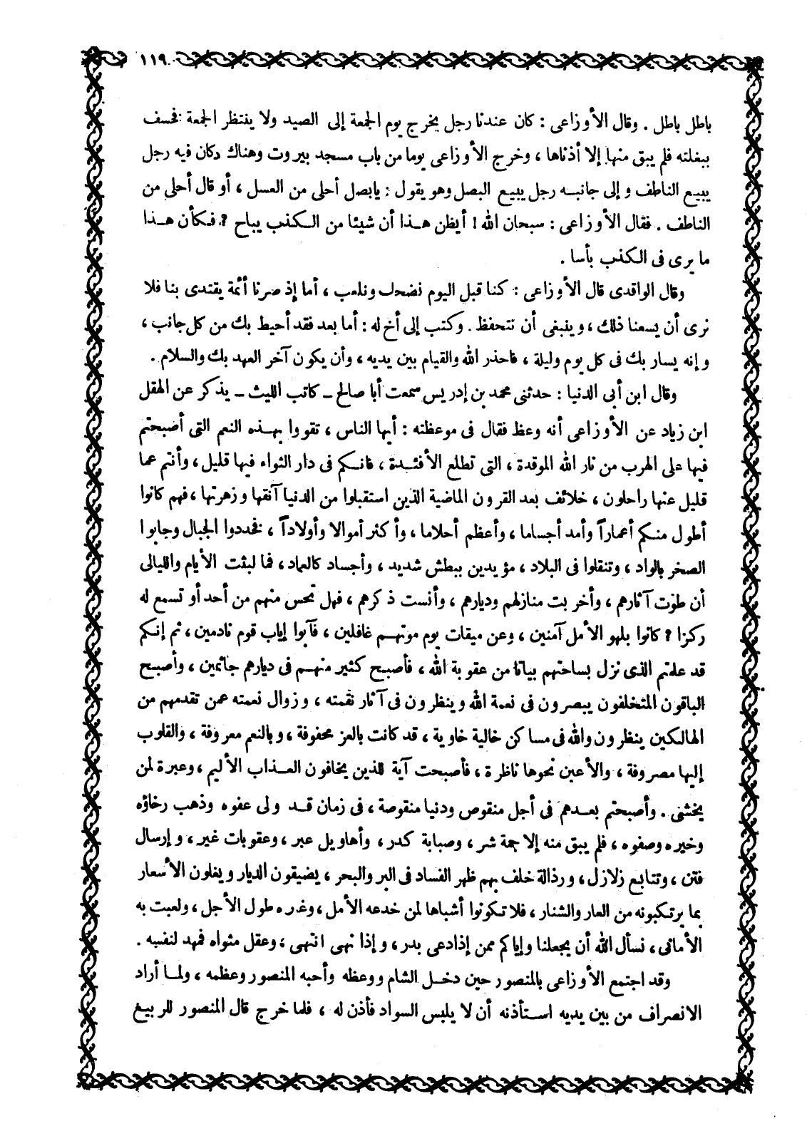 وَقَالَ ابْنُ أَبِي الدُّنْيَا: حَدَّثَنِي مُحَمَّدُ بْنُ إِدْرِيسَ سَمِعْتُ أَبَا صَالِحٍ- كَاتِبَ اللَّيْثِ- يذكر عن الهقل ابن زِيَادٍ عَنِ الْأَوْزَاعِيِّ أَنَّهُ وَعَظَ فَقَالَ فِي مَوْعِظَتِهِ: أَيُّهَا النَّاسُ، تَقَوَّوْا بِهَذِهِ النِّعَمِ الَّتِي أَصْبَحْتُمْ فِيهَا عَلَى الْهَرَبِ مِنْ نَارِ اللَّهِ الموقدة، التي تطلع الْأَفْئِدَةِ، فَإِنَّكُمْ فِي دَارٍ الثَّوَاءُ فِيهَا قَلِيلٌ، وأنتم عما قليل عنها راحلون، خلائف بعد القرون الماضية الذين استقبلوا من الدنيا آنقها وَزَهْرَتَهَا، فَهُمْ كَانُوا أَطْوَلَ مِنْكُمْ أَعْمَارًا وَأَمَدَّ أجساما، وأعظم أحلاما، وأكثر أموالا وأولادا، فخددوا الجبال وجابوا الصخر بالواد، وتنقلوا فِي الْبِلَادِ، مُؤَيَّدِينَ بِبَطْشٍ شَدِيدٍ، وَأَجْسَادٍ كَالْعِمَادِ، فما لبثت الأيام والليالي أن طوت آثارهم، وأخربت منازلهم وديارهم، وأنست ذكرهم، فهل تحس منهم من أحد أو تسمع له ركزا؟ كانوا بلهو الأمل آمنين، وعن ميقات يوم موتهم غافلين، فآبوا إياب قَوْمٍ نَادِمِينَ، ثُمَّ إِنَّكُمْ قَدْ عَلِمْتُمُ الَّذِي نزل بساحتهم بياتا مِنْ عُقُوبَةِ اللَّهِ، فَأَصْبَحَ كَثِيرٌ مِنْهُمْ فِي ديارهم جاثمين، وأصبح الباقون المتخلفون يبصرون في نعمة الله وينظرون في آثار نقمته، وزوال نعمته عمن تقدمهم من الهالكين ينظرون والله في مساكن خالية خاوية، قد كانت بالعز محفوفة، وبالنعم معروفة، والقلوب إليها مصروفة، والأعين نحوها ناظرة، فأصبحت آيَةٌ لِلَّذِينَ يَخَافُونَ الْعَذَابَ الْأَلِيمَ، وَعِبْرَةٌ لِمَنْ يخشى. وأصبحتم بعدهم في أجل منقوص ودنيا منقوصة، فِي زَمَانٍ قَدْ وَلَّى عَفْوُهُ وَذَهَبَ رَخَاؤُهُ وخيره وصفوه، فلم يبق منه إلا جمة شر، وصبابة كدر، وأهاويل عبر، وعقوبات غير، وَإِرْسَالُ فِتَنٍ، وَتَتَابُعُ زَلَازِلَ، وَرُذَالَةُ خَلْفٍ بِهِمْ ظهر الفساد في البر والبحر، يضيقون الديار ويغلون الأسعار بما يرتكبونه من العار والشنار، فلا تكونوا أشباها لمن خدعه الأمل، وغيره طول الأجل، ولعبت به الأماني، نسأل الله أن يجعلنا وإياكم ممن إذا دعي بدر، وإذا نهى انتهى، وَعَقَلَ مَثْوَاهُ فَمَهَدَ لِنَفْسِهِ.