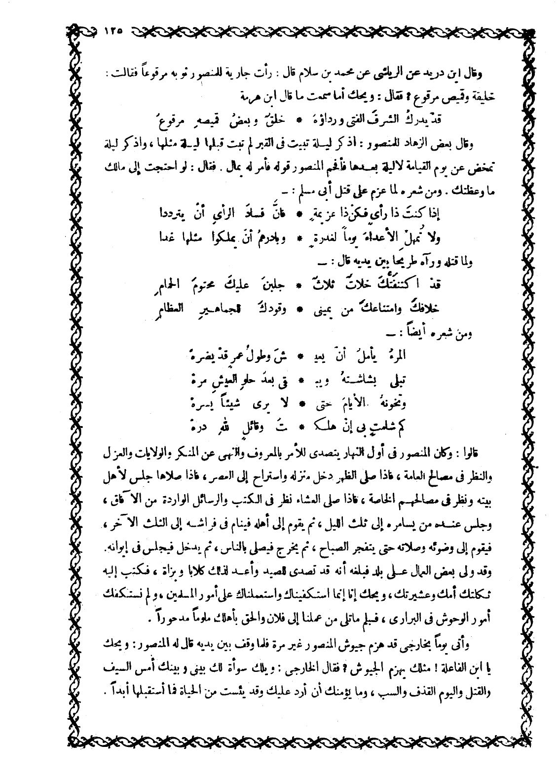 قَالُوا: وَكَانَ الْمَنْصُورُ فِي أَوَّلِ النَّهَارِ يَتَصَدَّى لِلْأَمْرِ بِالْمَعْرُوفِ وَالنَّهْيِ عَنِ المنكر والولايات والعزل والنظر في مصالح الْعَامَّةِ، فَإِذَا صَلَّى الظُّهْرَ دَخَلَ مَنْزِلَهُ وَاسْتَرَاحَ إِلَى الْعَصْرِ، فَإِذَا صَلَّاهَا جَلَسَ لِأَهْلِ بَيْتِهِ ونظر في مصالحهم الْخَاصَّةِ، فَإِذَا صَلَّى الْعَشَاءَ نَظَرَ فِي الْكُتُبِ وَالرَّسَائِلِ الْوَارِدَةِ مِنَ الْآفَاقِ، وَجَلَسَ عِنْدَهُ مَنْ يُسَامِرُهُ إِلَى ثُلُثِ اللَّيْلِ، ثُمَّ يَقُومُ إِلَى أَهْلِهِ فَيَنَامُ فِي فِرَاشِهِ إِلَى الثُّلُثِ الْآخِرِ، فَيَقُومُ إِلَى وَضُوئِهِ وَصَلَاتِهِ حَتَّى يَتَفَجَّرَ الصَّبَاحُ، ثُمَّ يَخْرُجُ فَيُصَلِّي بِالنَّاسِ، ثُمَّ يَدْخُلُ فَيَجْلِسُ فِي إِيوَانِهِ.