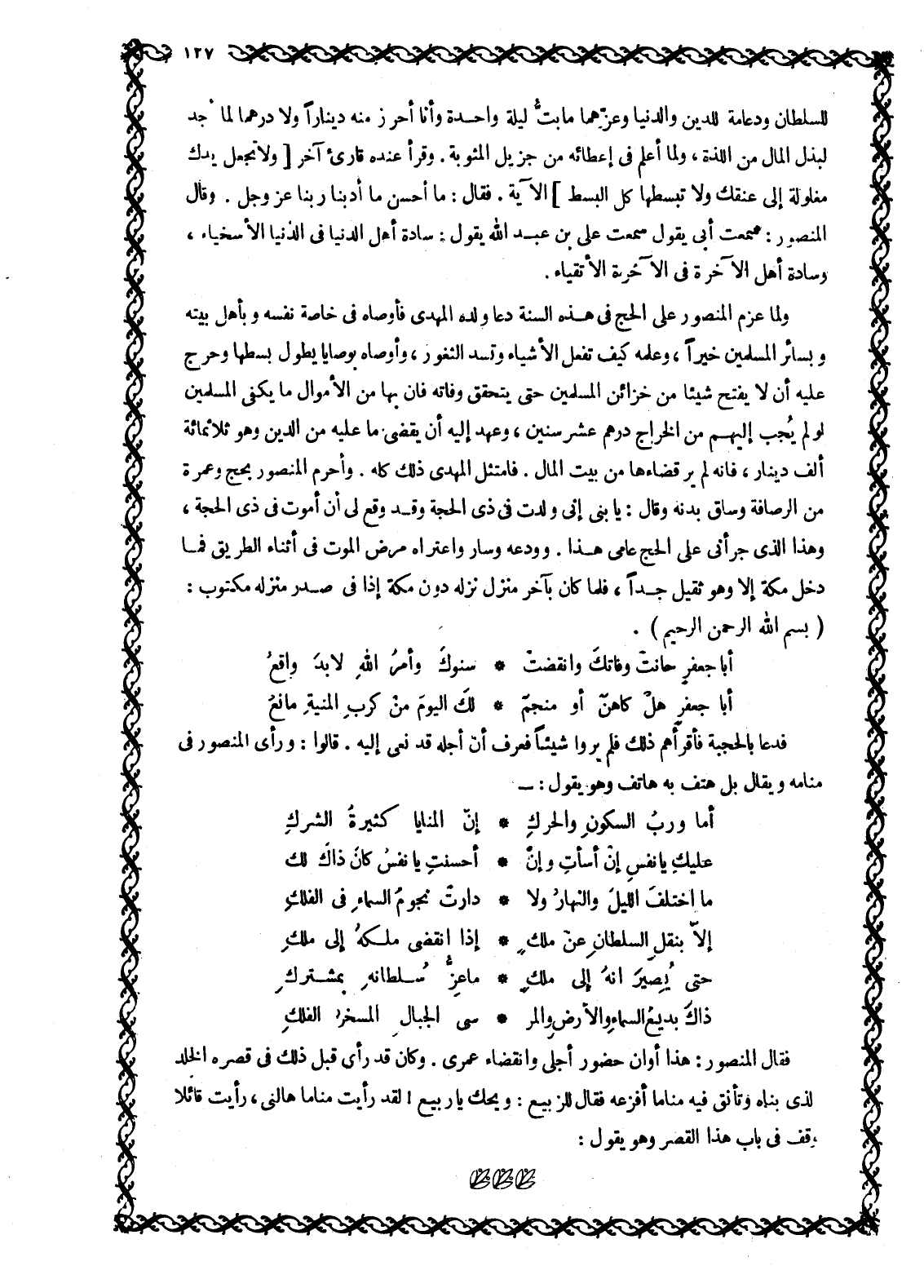 فَدَعَا بِالْحَجَبَةِ فأقرأهم ذَلِكَ فَلَمْ يَرَوْا شَيْئًا فَعَرَفَ أَنَّ أَجْلَهُ قَدْ نُعِيَ إِلَيْهِ. قَالُوا: وَرَأَى الْمَنْصُورُ فِي مَنَامِهِ وَيُقَالُ بَلْ هَتَفَ بِهِ هَاتِفٌ وَهُوَ يَقُولُ: -