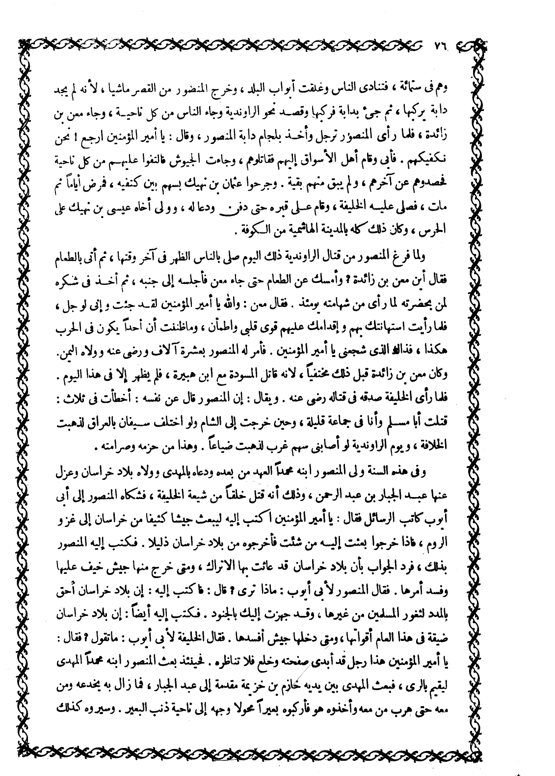 وَهُمْ فِي سِتِّمِائَةٍ، فَتَنَادَى النَّاسُ وَغُلِّقَتْ أَبْوَابُ الْبَلَدِ، وَخَرَجَ الْمَنْصُورُ مِنَ الْقَصْرِ مَاشِيًا، لِأَنَّهُ لم يجد دَابَّةٌ يَرْكَبُهَا، ثُمَّ جِيءَ بِدَابَّةٍ فَرَكِبَهَا وَقَصَدَ نَحْوَ الرَّاوَنْدِيَّةِ وَجَاءَ النَّاسُ مِنْ كُلِّ نَاحِيَةٍ، وجاء معن من زائدة، فلما رأى المنصور تَرَجَّلَ وَأَخَذَ بِلِجَامِ دَابَّةِ الْمَنْصُورِ، وَقَالَ: يَا أمير المؤمنين ارجع! نحن نكفيكهم. فأبى وقام أهل الأسواق إِلَيْهِمْ فَقَاتَلُوهُمْ، وَجَاءَتِ الْجُيُوشُ فَالْتَفُّوا عَلَيْهِمْ مِنْ كُلِّ نَاحِيَةٍ فَحَصَدُوهُمْ عَنْ آخِرِهِمْ، وَلَمْ يَبْقَ مِنْهُمْ بَقِيَّةٌ. وَجَرَحُوا عُثْمَانَ بْنَ نَهِيكٍ بِسَهْمٍ بين كتفيه، فمرض أياما ثم مات، فصلى عليه الخليفة، وَقَامَ عَلَى قَبْرِهِ حَتَّى دُفِنَ وَدَعَا لَهُ، وَوَلَّى أَخَاهُ عِيسَى بْنَ نَهِيكٍ عَلَى الْحَرَسِ، وَكَانَ ذَلِكَ كُلُّهُ بِالْمَدِينَةِ الْهَاشِمِيَّةِ مِنَ الْكُوفَةِ.