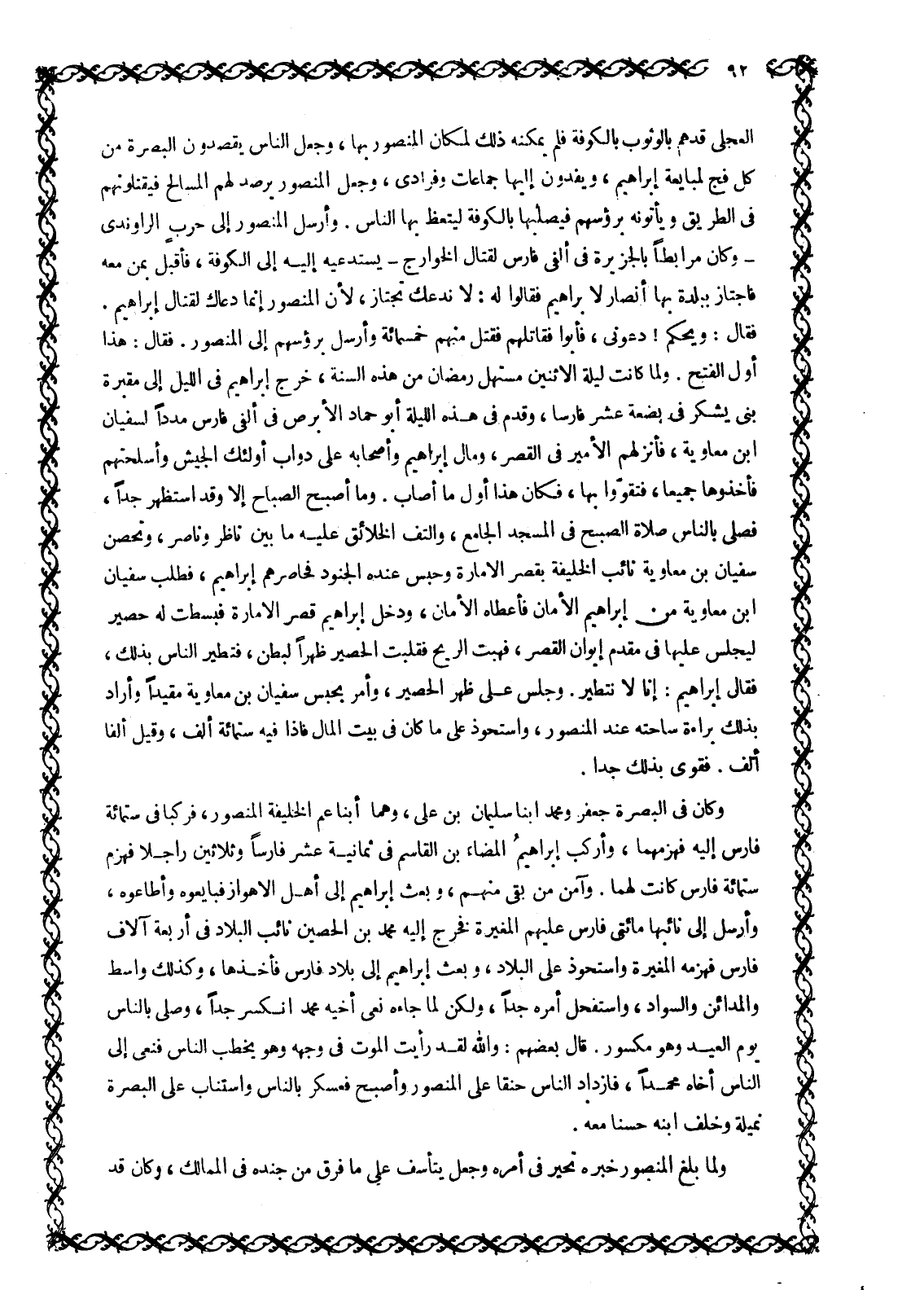 وَلَمَّا بَلَغَ الْمَنْصُورَ خَبَرُهُ تَحَيَّرَ فِي أَمْرِهِ وَجَعَلَ يَتَأَسَّفُ عَلَى مَا فَرَّقَ مِنْ جُنْدِهِ فِي الْمَمَالِكِ، وَكَانَ قَدْ