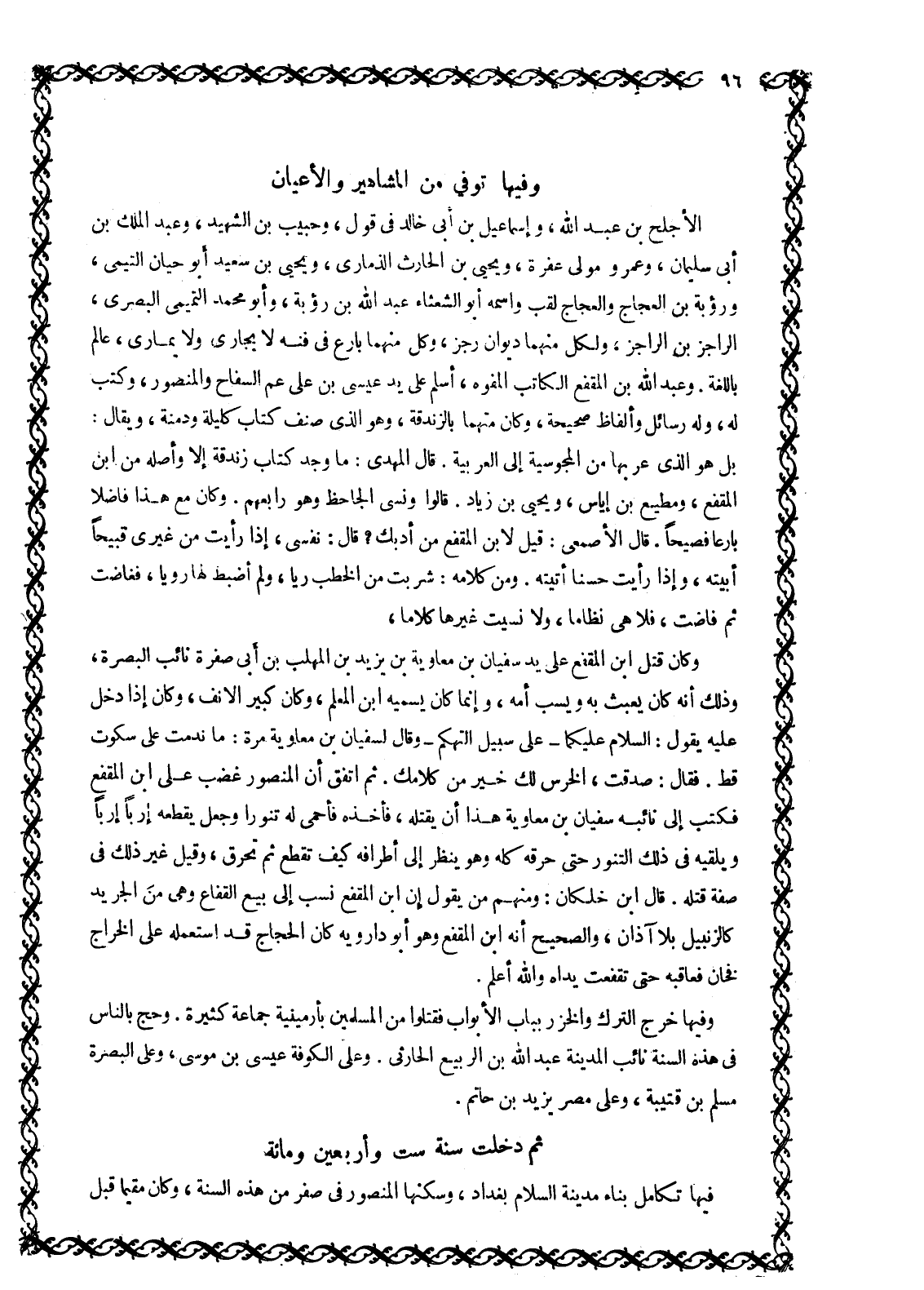 بَلْ هُوَ الَّذِي عَرَّبَهَا مِنَ الْمَجُوسِيَّةِ إلى العربية. قال المهدي: ما وجد كِتَابَ زَنْدَقَةٍ إِلَّا وَأَصْلُهُ مِنِ ابْنِ الْمُقَفَّعِ، وَمُطِيعُ بْنُ إِيَاسٍ، وَيَحْيَى بْنُ زِيَادٍ. قَالُوا ونسي الجاحظ وَهُوَ رَابِعُهُمْ. وَكَانَ مَعَ هَذَا فَاضِلًا بَارِعًا فَصِيحًا. قَالَ الْأَصْمَعِيُّ: قِيلَ لِابْنِ الْمُقَفَّعِ مَنْ أَدَّبَكَ؟ قَالَ: نَفْسِي، إِذَا رَأَيْتُ مِنْ غَيْرِي قَبِيحًا أَبَيْتُهُ، وَإِذَا رَأَيْتُ حَسَنًا أَتَيْتُهُ. وَمِنْ كَلَامِهِ: شَرِبْتُ مِنَ الْخُطَبِ رَيًّا، وَلَمْ أَضْبُطْ لَهَا رَوِيًّا، فَغَاضَتْ ثُمَّ فَاضَتْ، فَلَا هِيَ نظاما، ولا نسيت غيرها كلاما، وكان قتل ابن المقفع عَلَى يَدِ سُفْيَانَ بْنِ مُعَاوِيَةَ بْنِ يَزِيدَ بن المهلب بن أَبِي صُفْرَةَ نَائِبِ الْبَصْرَةِ، وَذَلِكَ أَنَّهُ كَانَ يَعْبَثُ بِهِ وَيَسُبُّ أُمَّهُ، وَإِنَّمَا كَانَ يُسَمِّيهِ ابن المعلم، وَكَانَ كَبِيرَ الْأَنْفِ، وَكَانَ إِذَا دَخَلَ عَلَيْهِ يَقُولُ: السَّلَامُ عَلَيْكُمَا- عَلَى سَبِيلِ التَّهَكُّمِ- وَقَالَ لسفيان بن معاوية مَرَّةً: مَا نَدِمْتُ عَلَى سُكُوتٍ قَطُّ. فَقَالَ: صدقت، الخرس لك خير من كلامك. ثم اتفق أن المنصور غضب عَلَى ابْنِ الْمُقَفَّعِ فَكَتَبَ إِلَى نَائِبِهِ سُفْيَانَ بْنِ مُعَاوِيَةَ هَذَا أَنْ يَقْتُلَهُ، فَأَخَذَهُ فَأَحْمَى لَهُ تَنُّورًا وَجَعَلَ يُقَطِّعُهُ إِرَبًا إِرَبًا وَيُلْقِيهِ في ذلك التنور حتى حرقة كُلَّهُ وَهُوَ يَنْظُرُ إِلَى أَطْرَافِهِ كَيْفَ تُقْطَعُ ثُمَّ تُحْرَقُ، وَقِيلَ غَيْرُ ذَلِكَ فِي صِفَةِ قَتْلِهِ. قَالَ ابْنُ خِلِّكَانَ: وَمِنْهُمْ مَنْ يَقُولُ إن ابن المقفع نسب إِلَى بَيْعِ الْقِفَاعِ وَهِيَ مِنَ الْجَرِيدِ كَالزِّنْبِيلِ بِلَا آذَانٍ، وَالصَّحِيحُ أَنَّهُ ابْنُ الْمُقَفَّعِ وَهُوَ أبو دارويه كَانَ الْحَجَّاجُ قَدِ اسْتَعْمَلَهُ عَلَى الْخَرَاجِ فَخَانَ فَعَاقَبَهُ حَتَّى تَقَفَّعَتْ يَدَاهُ وَاللَّهُ أَعْلَمُ.