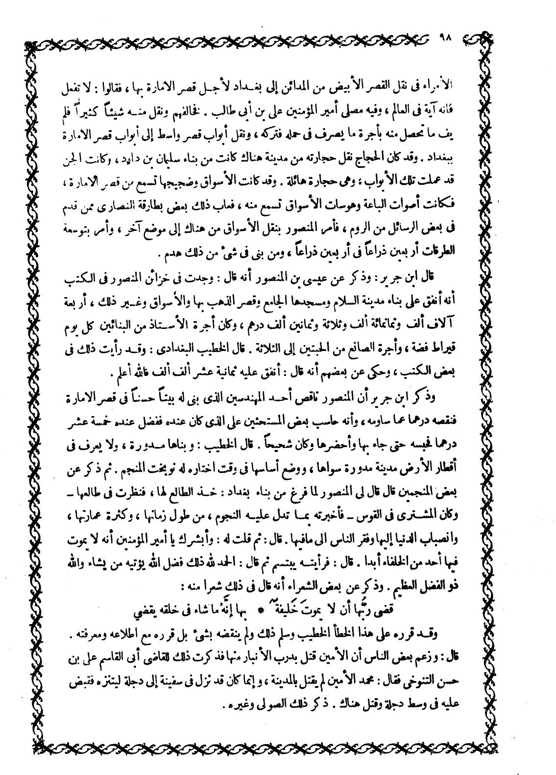 الْأُمَرَاءَ فِي نَقْلِ الْقَصْرِ الْأَبْيَضِ مِنَ الْمَدَائِنِ إلى بغداد لأجل قصر الامارة بها، فقالوا: لَا تَفْعَلْ فَإِنَّهُ آيَةٌ فِي الْعَالَمِ، وَفِيهِ مُصَلَّى أَمِيرِ الْمُؤْمِنِينَ عَلِيِّ بْنِ أَبِي طَالِبٍ. فخالفهم وَنَقَلَ مِنْهُ شَيْئًا كَثِيرًا فَلَمْ يَفِ مَا تَحَصَّلَ مِنْهُ بِأُجْرَةِ مَا يُصْرَفُ فِي حَمْلِهِ فتركه، ونقل أبواب قصر واسط إلى أبواب قصر الامارة ببغداد. وقد كان الحجاج نقل حجارته مِنْ مَدِينَةٍ هُنَاكَ كَانَتْ مِنْ بِنَاءِ سُلَيْمَانَ بْنِ دَاوُدَ، وَكَانَتِ الْجِنُّ قَدْ عَمِلَتْ تِلْكَ الأبواب، وهي حجارة هائلة. وقد كانت الأسواق وضجيجها تسمع من قصر الامارة، فكانت أصوات الباعة وهوسات الْأَسْوَاقِ تُسْمَعُ مِنْهُ، فَعَابَ ذَلِكَ بَعْضُ بَطَارِقَةِ النَّصَارَى مِمَّنْ قَدِمَ فِي بَعْضِ الرَّسَائِلِ مِنَ الرُّومِ، فَأَمَرَ الْمَنْصُورُ بِنَقْلِ الْأَسْوَاقِ مِنْ هُنَاكَ إِلَى مَوْضِعٍ آخَرَ، وَأَمَرَ بِتَوْسِعَةِ الطُّرُقَاتِ أَرْبَعِينَ ذراعا في أَرْبَعِينَ ذِرَاعًا، وَمَنْ بَنَى فِي شَيْءٍ مِنْ ذَلِكَ هُدِمَ.
