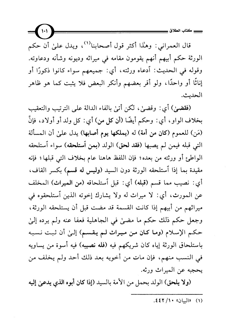 (فقضى) أي: وقضى، لكن أتى بالفاء الدالة على الترتيب والتعقيب بخلاف الواو، أي: وحكم أيضًا (أن كل من) أي: كل ولد أو أولاد، فإنَّ (مَن) للعموم (كان من أمة) له (يملكها يوم أصابها) يدل على أن المسألة التي قبله فيمن لم يصبها (فقد لحق) الولد (بمن استلحقه) سواء استلحقه الواطئ أو ورثته من بعده؛ فإن اللفظ ها هنا عام بخلاف التي قبلها؛ فإنه مقيدة بما إذا استلحقه الورثة دون السيد (وليس له قسم) بكسر القاف، أي: نصيب مما قسم (قبله) أي: قبل استلحاقه (من الميراث) المخلف عن المورث، أي: لا ميراث له ولا يشارك إخوته الذين استلحقوه في ميراثهم من أبيهم إذا كانت القسمة قد مضت قبل أن يستلحقه الورثة، وجعل حكم ذلك حكم ما مضى في الجاهلية فعفا عنه ولم يرده إلى حكم الإسلام (وما كان من ميراث لم يقسم) إلى أن ثبت نسبه باستلحاق الورثة إياه كان شريكهم فيه (فله نصيبه) فيه أسوة من يساويه في النسب منهم، فإن مات من أخويه بعد ذلك أحد ولم يخلف من يحجبه عن الميراث ورثه.