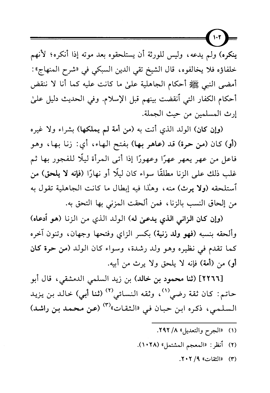 ينكره) ولم يدعه، وليس للورثة أن يستلحقوه بعد موته إذا أنكره؛ لأنهم خلفاؤه فلا يخالفوه، قال الشيخ تقي الدين السبكي في "شرح المنهاج": أمضى النبي - صلى الله عليه وسلم - أحكام الجاهلية على ما كانت عليه كما أنا لا ننقض أحكام الكفار التي أنقضت بينهم قبل الإسلام. وفي الحديث دليل على إرث المسلمين من حيث الجملة.
