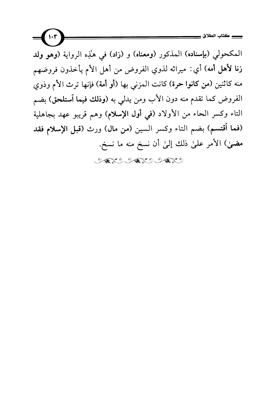 المكحولي (بإسناده) المذكور (ومعناه) و (زاد) في هذه الرواية (وهو ولد زنا لأهل أمه) أي: ميراثه لذوي الفروض من أهل الأم يأخذون فروضهم منه كاثنين (من كانوا حرة) كانت المزني بها (أو أمة) فإنها ترث الأم وذوي الفروض كما تقدم منه دون الأب ومن يدلي به (وذلك فيما استلحق) بضم التاء وكسر الحاء من الأولاد (في أول الإسلام) وهم قريبو عهد بجاهلية (فما اقتسم) بضم التاء وكسر السين (من مال) ورث (قبل الإسلام فقد مضى) الأمر على ذلك إلى أن نسخ منه ما نسخ.