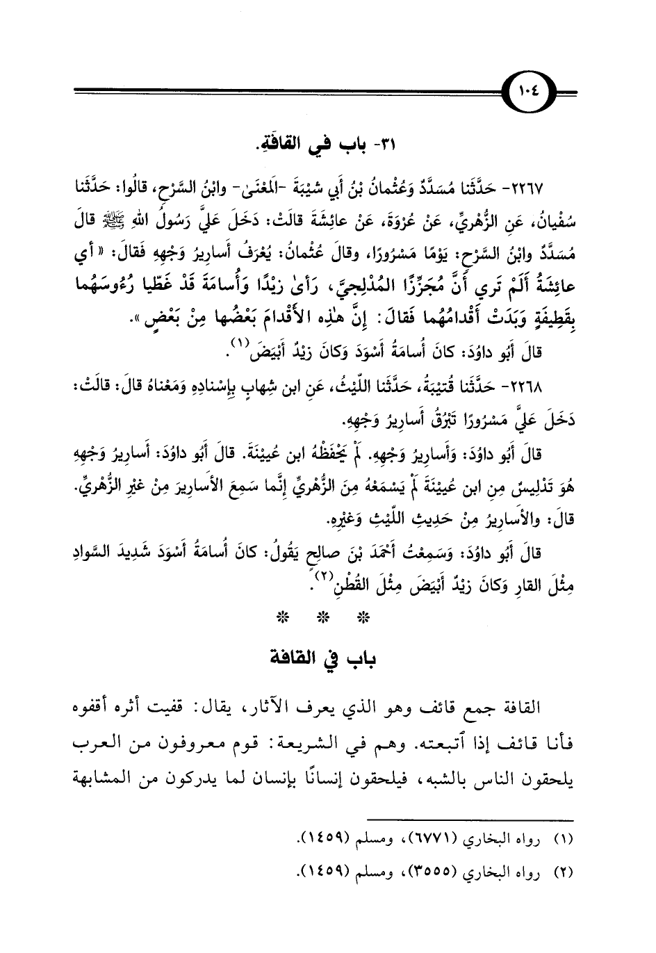 2267 - حَدَّثَنا مُسَدَّدٌ وَعُثْمانُ بْنُ أَبِي شَيْبَةَ - المَعْنَى - وابْنُ السَّرْحِ، قَالُوا: حَدَّثَنا سُفْيانُ، عَنِ الزُّهْرِيِّ، عَنْ عُرْوَةَ، عَنْ عَائِشَةَ قَالَتْ: دَخَلَ عَليَّ رَسُولُ اللهِ - صلى الله عليه وسلم - قَالَ مُسَدَّدٌ وابْنُ السَّرْحِ: يَوْمًا مَسْرُورًا، وقَالَ عُثْمانُ: يُعْرَفُ أَسارِيرُ وَجْهِهِ فَقَالَ: "أَي عَائِشَةُ أَلَمْ تَري أَنَّ مُجَزِّزًا المُدْلِجيَّ، رَأى زيْدًا وَأُسامَةَ قَدْ غَطَّيَا رُءُوسَهُمَا بِقَطِيفَةٍ وَبَدَتْ أَقْدامُهُما فَقَالَ: إِنَّ هذِه الأَقْدامَ بَعْضُها مِنْ بَعْضٍ".