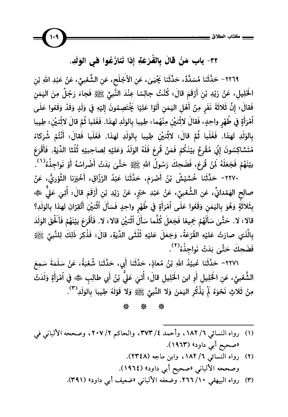 2269 - حَدَّثَنا مُسَدَّدٌ، حَدَّثَنا يَحْيَى، عَنِ الأَجْلَحِ، عَنِ الشَّعْبيِّ، عَنْ عَبْدِ اللهِ بْنِ الخَلِيلِ، عَنْ زيْدِ بْنِ أَرْقَمَ قَالَ: كُنْتُ جالِسًا عِنْدَ النَّبيِّ - صلى الله عليه وسلم - فَجاءَ رَجُلٌ مِنَ اليَمَنِ فَقَالَ: إِنَّ ثَلاثَةَ نَفَرٍ مِنْ أَهْلِ اليَمَنِ أَتَوْا عَلِيًّا يَخْتَصِمُونَ إِليْهِ في وَلَدٍ وَقَدْ وَقَعُوا عَلَى امْرَأَةٍ في طُهْرٍ واحِدٍ، فَقَالَ لاِثْنيْنِ مِنْهُمَا: طِيبا بِالوَلَدِ لهذا. فَغَلبا ثُمَّ قَالَ لاِثْنيْنِ: طِيبا بِالوَلَدِ لهذا. فَغَلَبا ثُمَّ قَالَ: لاِثْنيْنِ طِيبا بِالوَلَدِ لهذا. فَغَلَبا فَقَالَ: أَنْتُمْ شُرَكاءُ مُتَشاكِسُونَ إِنِّي مُقْرِعٌ بيْنَكُمْ فَمَنْ قُرِعَ فَلَهُ الوَلَدُ وَعَليْهِ لِصاحِبيْهِ ثُلُثا الدِّيَةِ. فَأَقْرَعَ بيْنَهُمْ فَجَعَلَهُ لِمَنْ قُرِعَ، فَضَحِكَ رَسُولُ اللهِ - صلى الله عليه وسلم - حَتَّى بَدَتْ أَضْراسُهُ أَوْ نَواجِذُهُ (¬1).