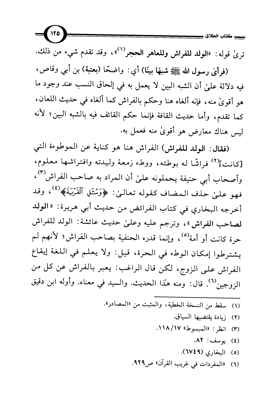 (فقال: الولد للفراش) الفراش هنا هو كناية عن الموطوءة التي [كانت] (¬2) فراشًا له بوطئه، ووطء زمعة وليدته وافتراشها معلوم، وأصحاب أبي حنيفة يحملونه على أن المراد به صاحب الفراش (¬3)، فهو على حذف المضاف كقوله تعالى: {وَاسْأَلِ الْقَرْيَةَ} (¬4)، وقد أخرجه البخاري في كتاب الفرائض من حديث أبي هريرة: "الولد لصاحب الفراش"، وترجم عليه وعلى حديث عائشة: الولد للفراش حرة كانت أو أمة (¬5)، وإنما قدره الحنفية بصاحب الفراش؛ لأنهم لم يشترطوا إمكان الوطء في الحرة، قيل: ولا يعلم في اللغة إيقاع الفراش على الزوج، لكن قال الراغب: يعبر بالفراش عن كل من الزوجين (¬6). قال: ومنه هذا الحديث. والسيد في معناه. وأوله ابن دقيق
