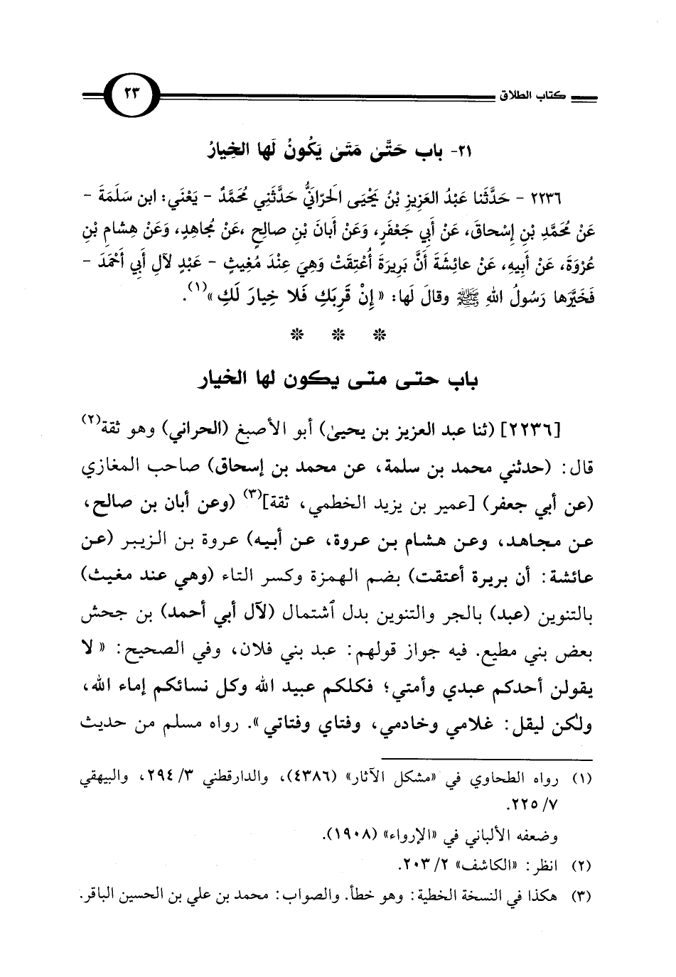 [2236] (ثنا عبد العزيز بن يحيى) أبو الأصبغ (الحراني) وهو ثقة (¬2) قال: (حدثني محمد بن سلمة، عن محمد بن إسحاق) صاحب المغازي (عن أبي جعفر) [عمير بن يزيد الخطمي، ثقة] (¬3) (وعن أبان بن صالح، عن مجاهد، وعن هشام بن عروة، عن أبيه) عروة بن الزبير (عن عائشة: أن بريرة أعتقت) بضم الهمزة وكسر التاء (وهي عند مغيث) بالتنوين (عبد) بالجر والتنوين بدل اشتمال (لآل أبي أحمد) بن جحش بعض بني مطيع. فيه جواز قولهم: عبد بني فلان، وفي الصحيح: "لا يقولن أحدكم عبدي وأمتي؛ فكلكم عبيد الله وكل نسائكم إماء الله، ولكن ليقل: غلامي وخادمي، وفتاي وفتاتي". رواه مسلم من حديث