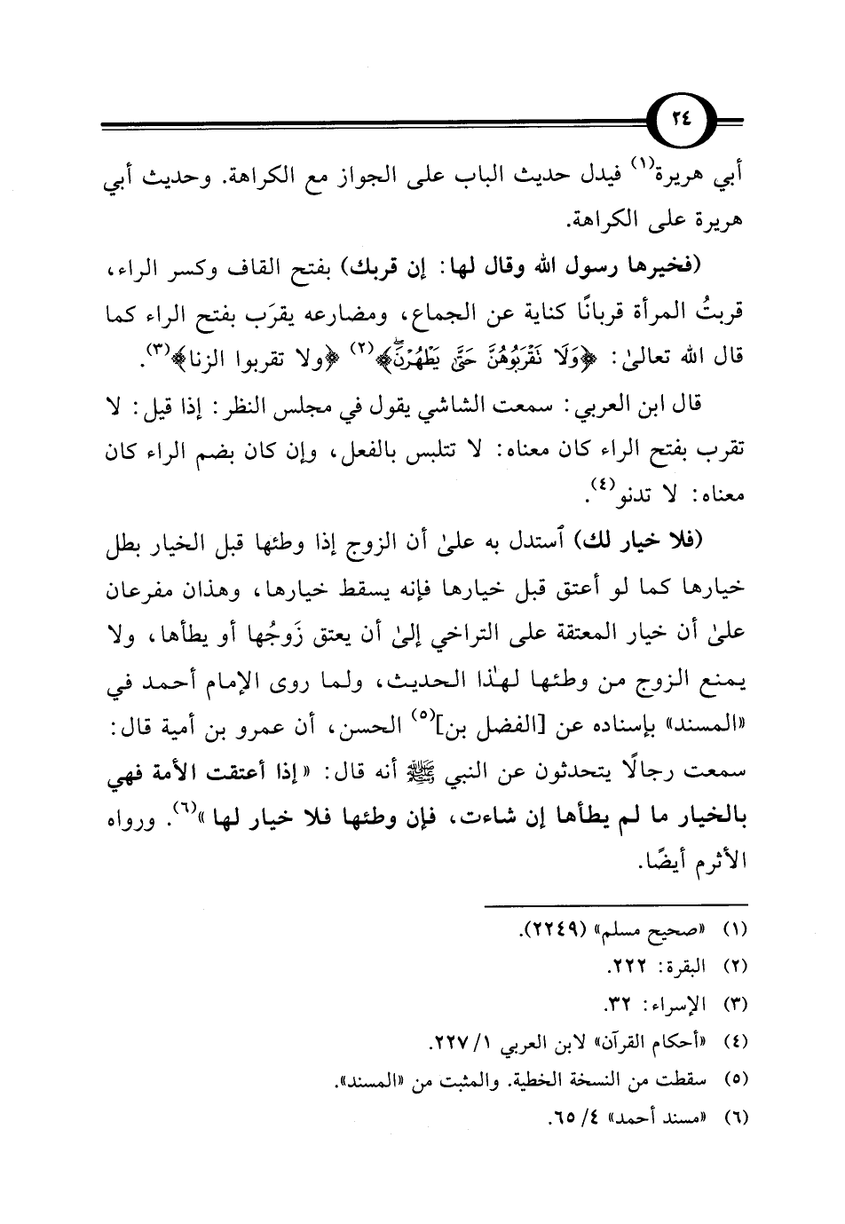 (فخيرها رسول الله وقال لها: إن قربك) بفتح القاف وكسر الراء، قربتُ المرأة قربانًا كناية عن الجماع، ومضارعه يقرَب بفتح الراء كما قال الله تعالى: {وَلَا تَقْرَبُوهُنَّ حَتَّى يَطْهُرْنَ} (¬2) {وَلَا تَقْرَبُوا الزِّنَا} (¬3).