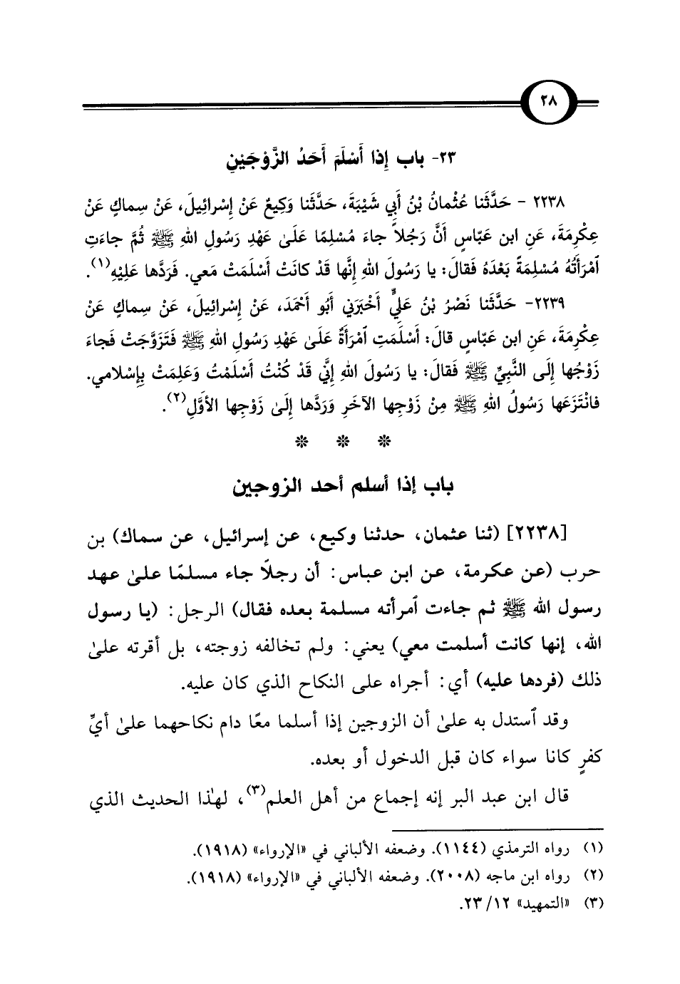 2238 - حَدَّثَنا عُثْمانُ بْنُ أَبِي شَيْبَةَ، حَدَّثَنا وَكِيعٌ عَنْ إِسْرائِيلَ، عَنْ سِماكٍ عَنْ عِكْرِمَةَ، عَنِ ابن عَبَّاسِ أَنَّ رَجُلًا جاءَ مُسْلِمًا عَلَى عَهْدِ رَسُولِ اللهِ - صلى الله عليه وسلم - ثُمَّ جاءَتِ امْرَأَتُهُ مُسْلِمَةً بَعْدَهُ فَقَالَ: يا رَسُولَ اللهِ إِنَّها قَدْ كَانَتْ أَسْلَمَتْ مَعي. فَرَدَّها عَلِيْهِ (¬1).