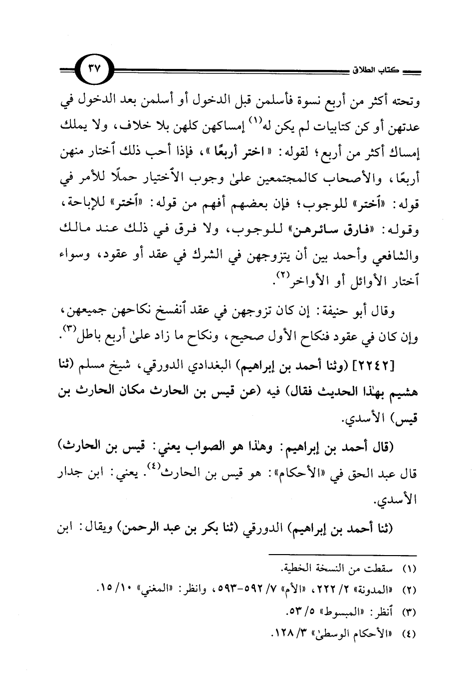 [2242] (وثنا أحمد بن إبراهيم) البغدادي الدورقي، شيخ مسلم (ثنا هشيم بهذا الحديث فقال) فيه (عن قيس بن الحارث مكان الحارث بن قيس) الأسدي.