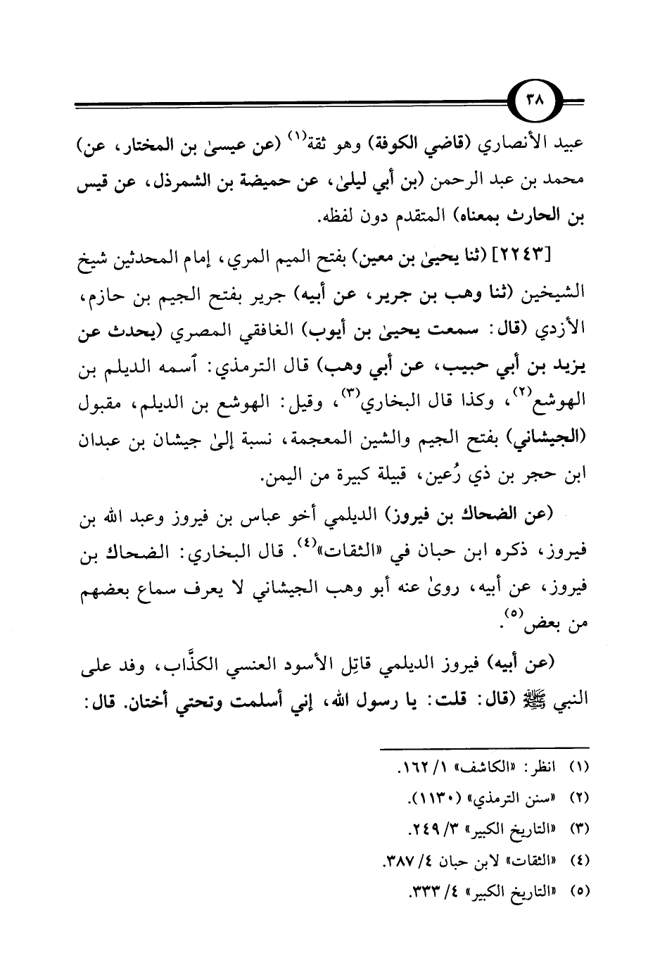 [2243] (ثنا يحيى بن معين) بفتح الميم المري، إمام المحدثين شيخ الشيخين (ثنا وهب بن جرير، عن أبيه) جرير بفتح الجيم بن حازم، الأزدي (قال: سمعت يحيى بن أيوب) الغافقي المصري (يحدث عن يزيد بن أبي حبيب، عن أبي وهب) قال الترمذي: اسمه الديلم بن الهوشع (¬2)، وكذا قال البخاري (¬3)، وقيل: الهوشع بن الديلم، مقبول (الجيشاني) بفتح الجيم والشين المعجمة، نسبة إلى جيشان بن عبدان بن حجر بن ذي رُعين، قبيلة كبيرة من اليمن.