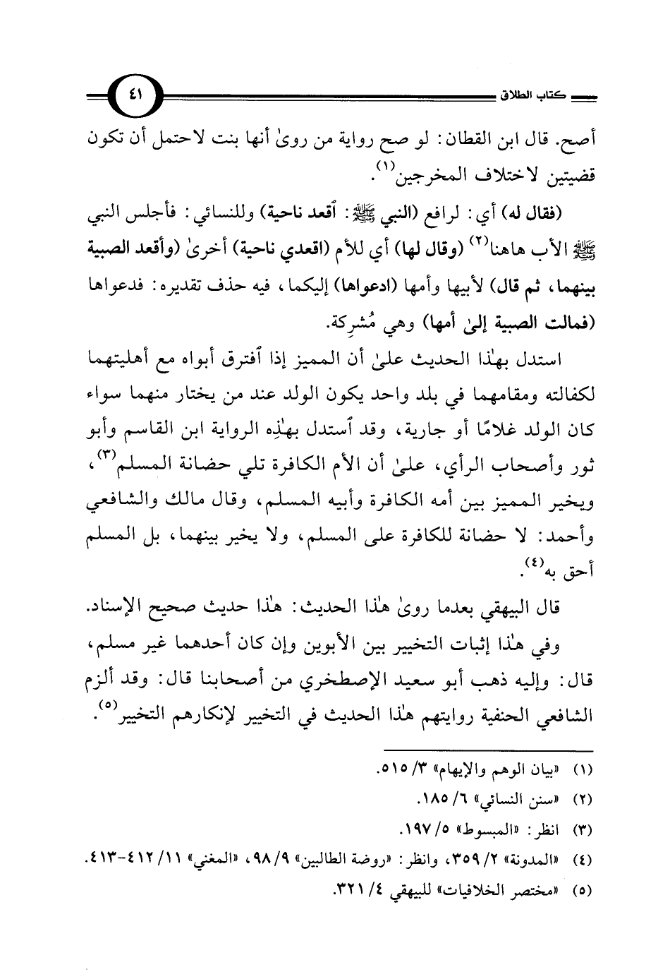 وفي هذا إثبات التخيير بين الأبوين وإن كان أحدهما غير مسلم، قال: وإليه ذهب أبو سعيد الإصطخري من أصحابنا قال: وقد ألزم الشافعي الحنفية روايتهم هذا الحديث في التخيير لإنكارهم التخيير (¬5).