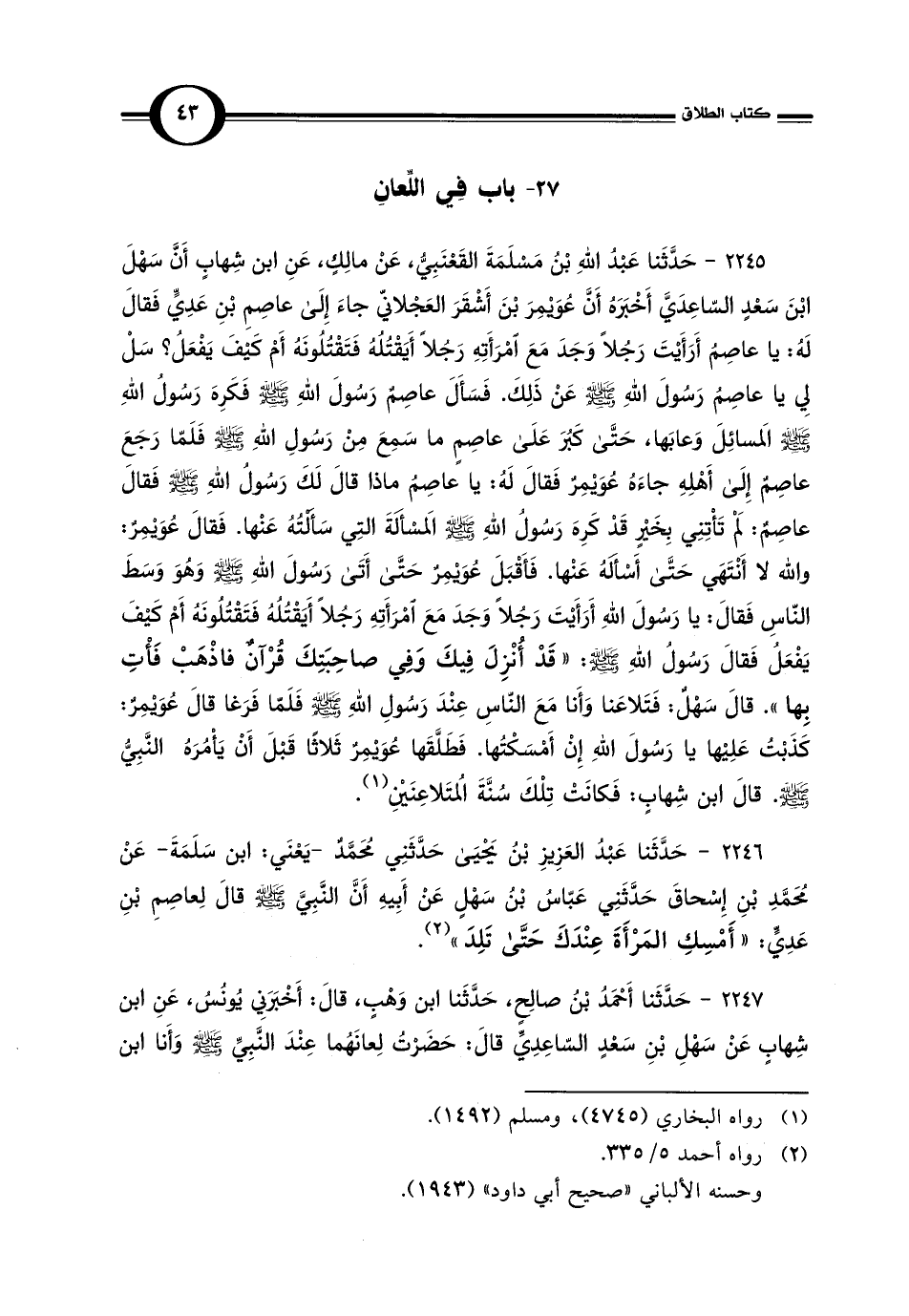 2245 - حَدَّثَنا عَبْدُ اللهِ بْنُ مَسْلَمَةَ القَعْنَبِيُّ، عَنْ مالِكٍ، عَنِ ابن شِهابٍ أَنَّ سَهْلَ بْنَ سَعْدٍ السّاعِدِيَّ أَخْبَرَهُ أَنَّ عُوَيْمِرَ بْنَ أَشْقَرَ العَجْلانّي جاءَ إِلَى عاصِمِ بْنِ عَدِيٍّ فَقَالَ لَهُ: يا عاصِمُ أَرَأَيْتَ رَجُلًا وَجَدَ مَعَ امْرَأَتِهِ رَجُلًا أَيَقْتُلُهُ فَتَقْتُلُونَهُ أَمْ كَيْفَ يَفْعَلُ؟ سَلْ لِي يا عاصِمُ رَسُولَ اللهِ - صلى الله عليه وسلم - عنْ ذَلِكَ. فَسَأَلَ عاصِمٌ رَسُولَ اللهِ - صلى الله عليه وسلم - فَكَرِهَ رَسُولُ اللهِ - صلى الله عليه وسلم - المَسائِلَ وَعابَها، حَتَّى كَبُرَ عَلَى عاصِمٍ ما سَمِعَ مِنْ رَسُولِ اللهِ - صلى الله عليه وسلم - فَلَمّا رَجَعَ عاصِمٌ إِلَى أَهْلِهِ جاءَهُ عُوَيْمِرٌ فَقَالَ لَهُ: يا عاصِمُ ماذا قَالَ لَكَ رَسُولُ اللهِ - صلى الله عليه وسلم - فَقَالَ عاصِمٌ: لَمْ تَأْتِنِي بِخَيْرٍ قَدْ كَرِهَ رَسُولُ اللهِ - صلى الله عليه وسلم - المَسْأَلَةَ التِي سَأَلْتُهُ عَنْها. فَقَالَ عُوَيْمِرٌ: والله لا أَنْتَهِي حَتَّى أَسْأَلَهُ عَنْها. فَأَقْبَلَ عُوَيْمِرٌ حَتَّى أَتَى رَسُولَ اللهِ - صلى الله عليه وسلم - وَهُوَ وَسَطَ النّاسِ فَقَالَ: يا رَسُولَ اللهِ أَرَأَيْتَ رَجُلًا وَجَدَ مَعَ امْرَأَتِهِ رَجُلًا أَيَقْتُلُهُ فَتَقْتُلُونَهُ أَمْ كَيْفَ يَفْعَلُ فَقَالَ رَسُولُ اللهِ - صلى الله عليه وسلم -: "قَدْ أُنْزِلَ فِيكَ وَفِي صاحِبَتِكَ قُرْآنٌ فاذْهَبْ فَأْتِ بِها". قَالَ سَهْلٌ: فَتَلاعَنا وَأَنا مَعَ النّاسِ عِنْدَ رَسُولِ اللهِ - صلى الله عليه وسلم - فَلَمّا فَرَغا قَالَ عُوَيْمِرٌ: كَذَبْتُ عَلِيْها يا رَسُولَ اللهِ إِنْ أَمْسَكْتُها. فَطَلَّقَها عُوَيْمِرٌ ثَلاثًا قَبْلَ أَنْ يَأْمُرَهُ النَّبِيُّ - صلى الله عليه وسلم -. قَالَ ابن شِهابٍ: فَكَانَتْ تِلْكَ سُنَّةَ المُتَلاعِنَيْنِ (¬1).