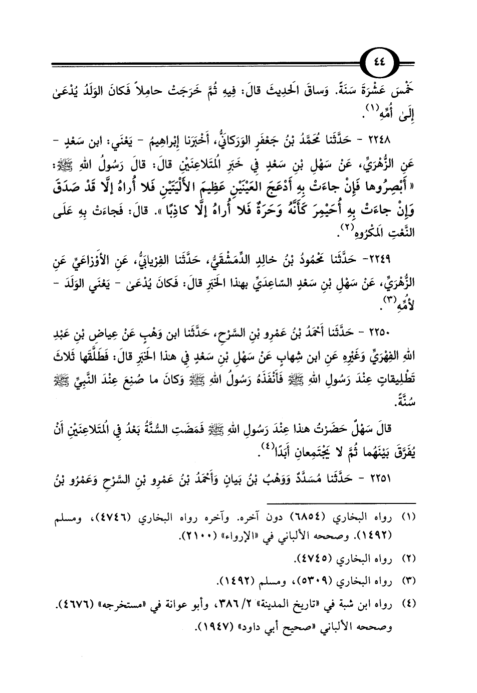 2249 - حَدَّثَنا مَحْمُودُ بْنُ خالِدٍ الدِّمَشْقِيُّ، حَدَّثَنا الفِرْيابِيُّ، عَنِ الأَوْزاعِيِّ عَنِ الزُّهْرِيِّ، عَنْ سَهْلِ بْنِ سَعْدٍ السّاعِدِيِّ بهذا الخَبَرِ قَالَ: فَكَانَ يُدْعَى - يَعْنِي الوَلَدَ - لأُمِّهِ (¬3).