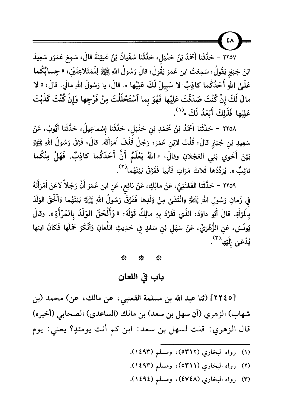 2258 - حَدَّثَنا أَحْمَدُ بْنُ مُحَمَّدِ بْنِ حَنْبَلٍ، حَدَّثَنا إِسْماعِيلُ، حَدَّثَنا أَيُّوبُ، عَنْ سَعِيدِ بْنِ جُبَيْرٍ قَالَ: قُلْتُ لابْنِ عُمَرَ: رَجُلٌ قَذَفَ امْرَأَتَهُ. قَالَ: فَرَّقَ رَسُولُ اللهِ - صلى الله عليه وسلم - بَيْنَ أَخَوي بَنِي العَجْلانِ وقَالَ: "اللهُ يَعْلَمُ أَنَّ أَحَدَكُما كاذِبٌ. فَهَلْ مِنْكُما تائِبٌ". يُرَدِّدُها ثَلاثَ مَرّاتٍ فَأَبَيا فَفَرَّقَ بَيْنَهُما (¬2).