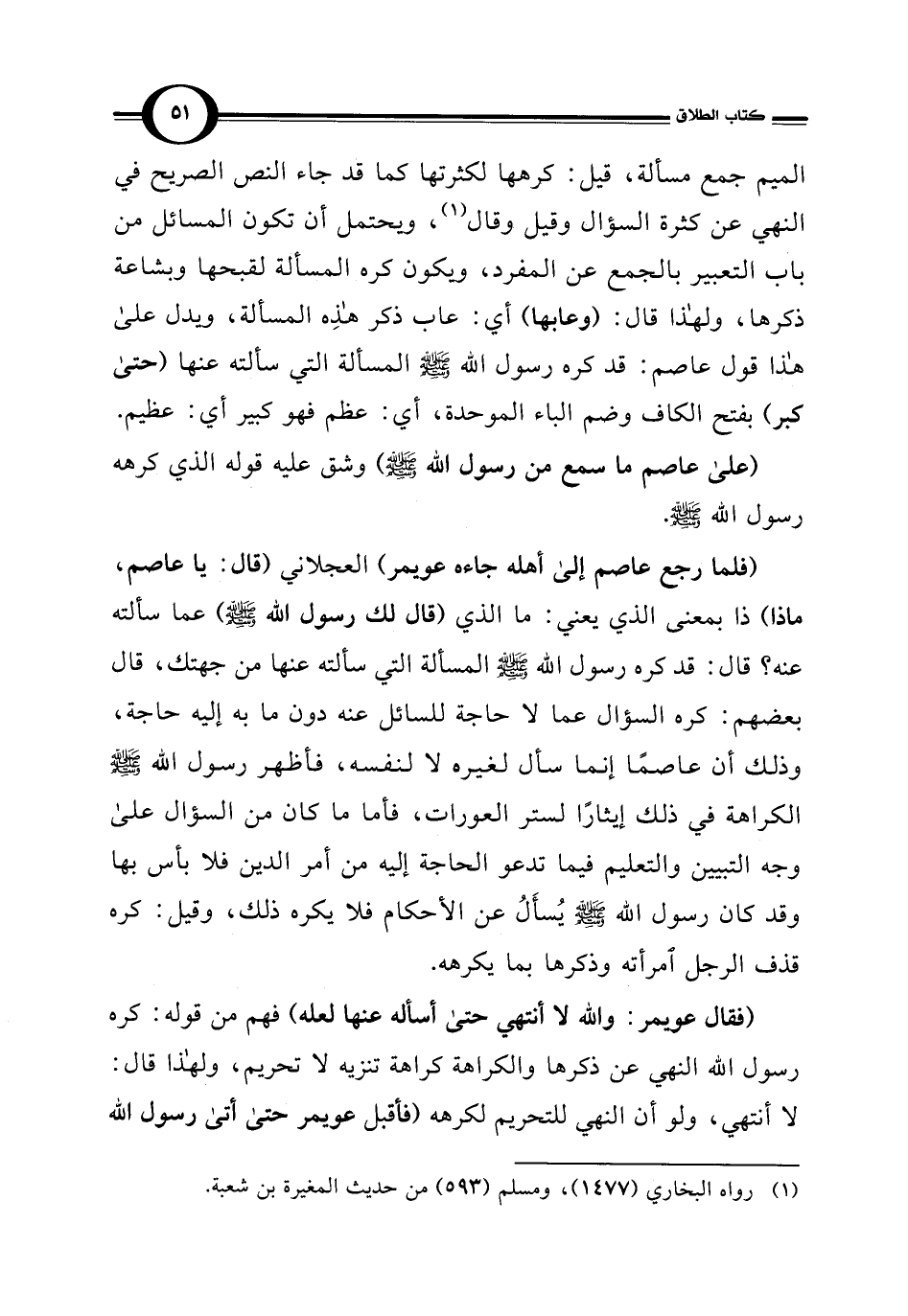 (فلما رجع عاصم إلى أهله جاءه عويمر) العجلاني (قال: يا عاصم، ماذا) ذا بمعنى الذي يعني: ما الذي (قال لك رسول الله - صلى الله عليه وسلم -) عما سألته عنه؟ قال: قد كره رسول الله - صلى الله عليه وسلم - المسألة التي سألته عنها من جهتك، قال بعضهم: كره السؤال عما لا حاجة للسائل عنه دون ما به إليه حاجة، وذلك أن عاصمًا إنما سأل لغيره لا لنفسه، فأظهر رسول الله - صلى الله عليه وسلم - الكراهة في ذلك إيثارًا لستر العورات، فأما ما كان من السؤال على وجه التبيين والتعليم فيما تدعو الحاجة إليه من أمر الدين فلا بأس بها وقد كان رسول الله - صلى الله عليه وسلم - يُسأَلُ عن الأحكام فلا يكره ذلك، وقيل: كره قذف الرجل امرأته وذكرها بما يكرهه.