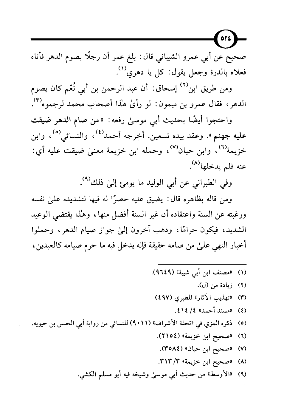 واحتجوا أيضًا بحديث أبي موسى رفعه: "من صام الدهر ضيقت عليه جهنم". وعقد بيده تسعين. أخرجه أحمد (¬4)، والنسائيُّ (¬5)، وابن خزيمة (¬6)، وابن حبَّان (¬7)، وحمله ابن خزيمة معنى ضيقت عليه أي: عنه فلم يدخلها (¬8).