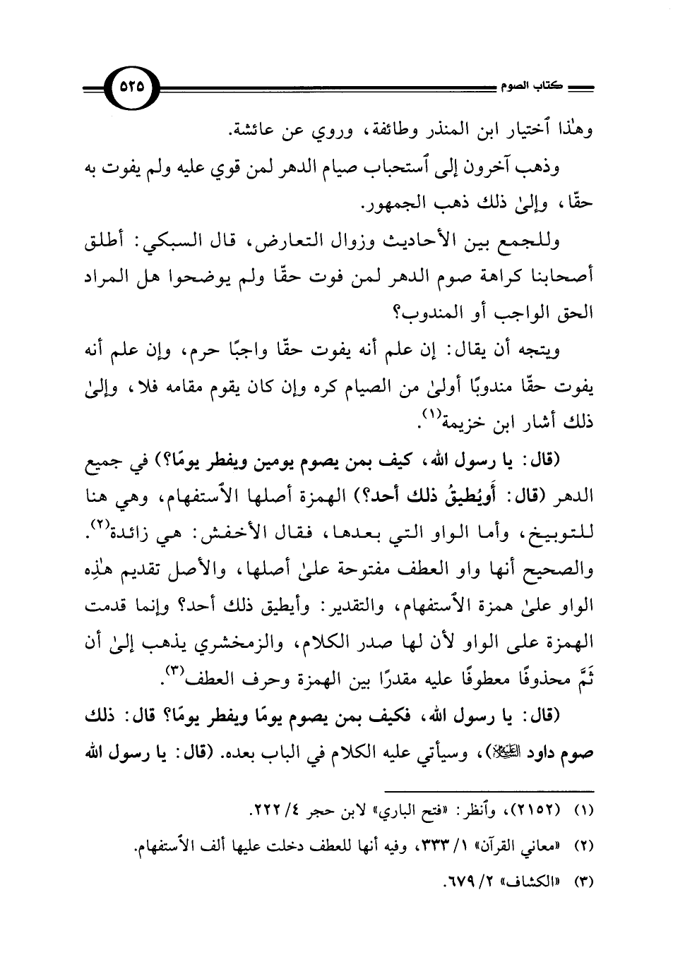 (قال: يا رسول الله، كيف بمن يصوم يومين ويفطر يومًا؟ ) في جميع الدهر (قال: أَو يُطيقُ ذلك أحد؟ ) الهمزة أصلها الاستفهام، وهي هنا للتوبيخ، وأما الواو التي بعدها، فقال الأخفش: هي زائدة (¬2). والصحيح أنها واو العطف مفتوحة على أصلها، والأصل تقديم هذِه الواو على همزة الاستفهام، والتقدير: وأيطيق ذلك أحد؟ وإنما قدمت الهمزة على الواو لأنَّ لها صدر الكلام، والزمخشري يذهب إلى أن ثَمَّ محذوفًا معطوفًا عليه مقدرًا بين الهمزة وحرف العطف (¬3).