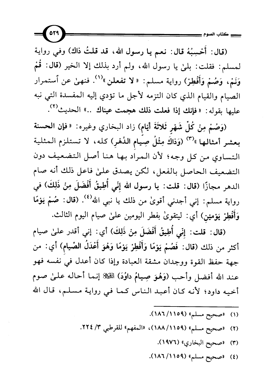 (قال: أَحْسِبُهُ قال: نعم يا رسول الله، قد قلتُ ذاك) وفي رواية لمسلم: فقلت: بلى يا رسول الله، ولم أرد بذلك إلا الخير (قال: قُمْ وَنَمْ، وَصُمْ وَأَفْطِرْ) رواية مسلم: "لا تفعلن" (¬1). فنهى عن استمرار الصيام والقيام الذي كان التزمه لأجل ما تؤدي إليه المفسدة التي نبه عليها بقوله: "فإنك إذا فعلت ذلك هجمت عيناك .. " الحديث (¬2).
