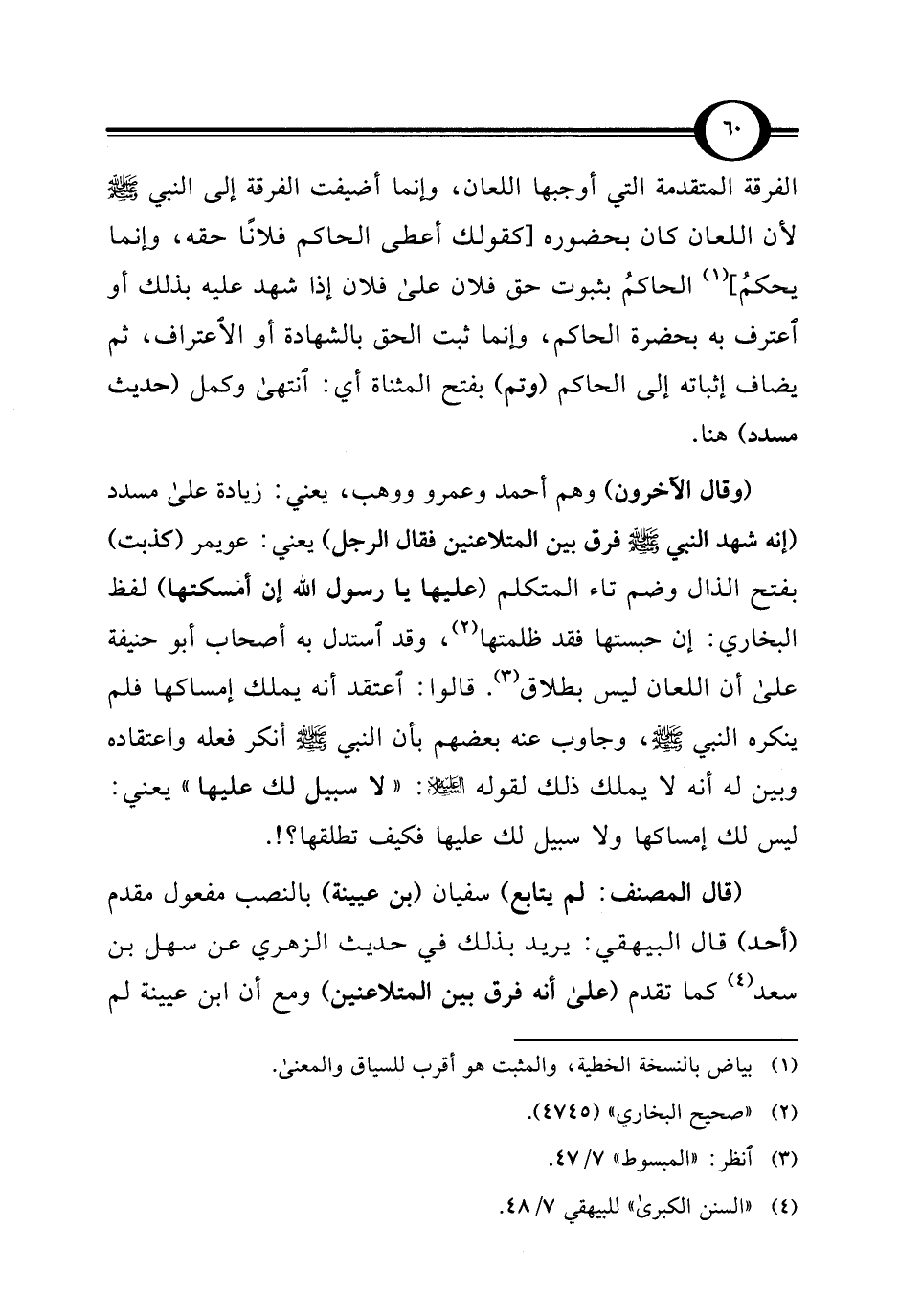 الفرقة المتقدمة التي أوجبها اللعان، وإنما أضيفت الفرقة إلى النبي - صلى الله عليه وسلم - لأن اللعان كان بحضوره [كقولك أعطى الحاكم فلانًا حقه، وإنما يحكمُ] (¬1) الحاكمُ بثبوت حق فلان على فلان إذا شهد عليه بذلك أو اعترف به بحضرة الحاكم، وإنما ثبت الحق بالشهادة أو الاعتراف، ثم يضاف إثباته إلى الحاكم (وتم) بفتح المثناة أي: انتهى وكمل (حديث مسدد) هنا.