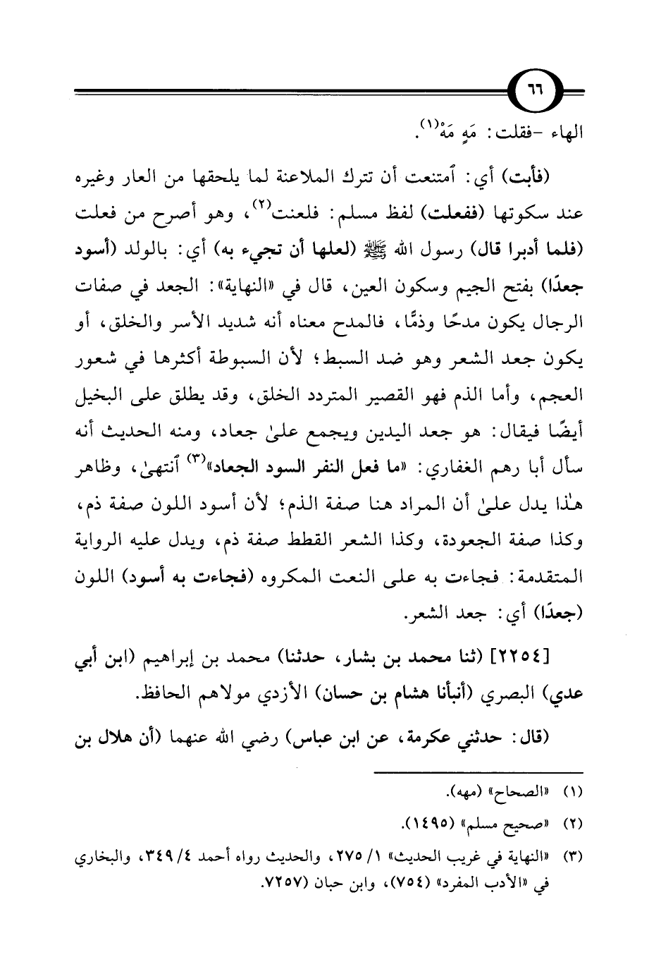 (فأبت) أي: امتنعت أن تترك الملاعنة لما يلحقها من العار وغيره عند سكوتها (ففعلت) لفظ مسلم: فلعنت (¬2)، وهو أصرح من فعلت (فلما أدبرا قال) رسول الله - صلى الله عليه وسلم - (لعلها أن تجيء به) أي: بالولد (أسود جعدًا) بفتح الجيم وسكون العين، قال في "النهاية": الجعد في صفات الرجال يكون مدحًا وذمًّا، فالمدح معناه أنه شديد الأسر والخلق، أو يكون جعد الشعر وهو ضد السبط؛ لأن السبوطة أكثرها في شعور العجم، وأما الذم فهو القصير المتردد الخلق، وقد يطلق على البخيل أيضًا فيقال: هو جعد اليدين ويجمع على جعاد، ومنه الحديث أنه سأل أبا رهم الغفاري: "ما فعل النفر السود الجعاد" (¬3) انتهى، وظاهر هذا يدل على أن المراد هنا صفة الذم؛ لأن أسود اللون صفة ذم، وكذا صفة الجعودة، وكذا الشعر القطط صفة ذم، ويدل عليه الرواية المتقدمة: فجاءت به على النعت المكروه (فجاءت به أسود) اللون (جعدًا) أي: جعد الشعر.