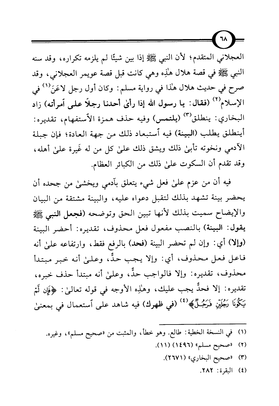 العجلاني المتقدم؛ لأن النبي - صلى الله عليه وسلم - إذا بين شيئًا لم يلزمه تكراره، وقد سنه النبي - صلى الله عليه وسلم - في قصة هلال هذِه وهي كانت قبل قصة عويمر العجلاني، وقد صرح في حديث هلال هذا في رواية مسلم: وكان أول رجل لاعَنَ (¬1) في الإسلام (¬2) (فقال: يا رسول الله إذا رأى أحدنا رجلًا على امرأته) زاد البخاري: ينطلق (¬3) (يلتمس) وفيه حذف همزة الاستفهام، تقديره: أينطلق يطلب (البينة) فيه استبعاد ذلك من جهة العادة؛ فإن جبلة الآدمي ونخوته تأبى ذلك ويشق ذلك على كل من له غَيرة على أهله، وقد تقدم أن السكوت على ذلك من الكبائر العظام.