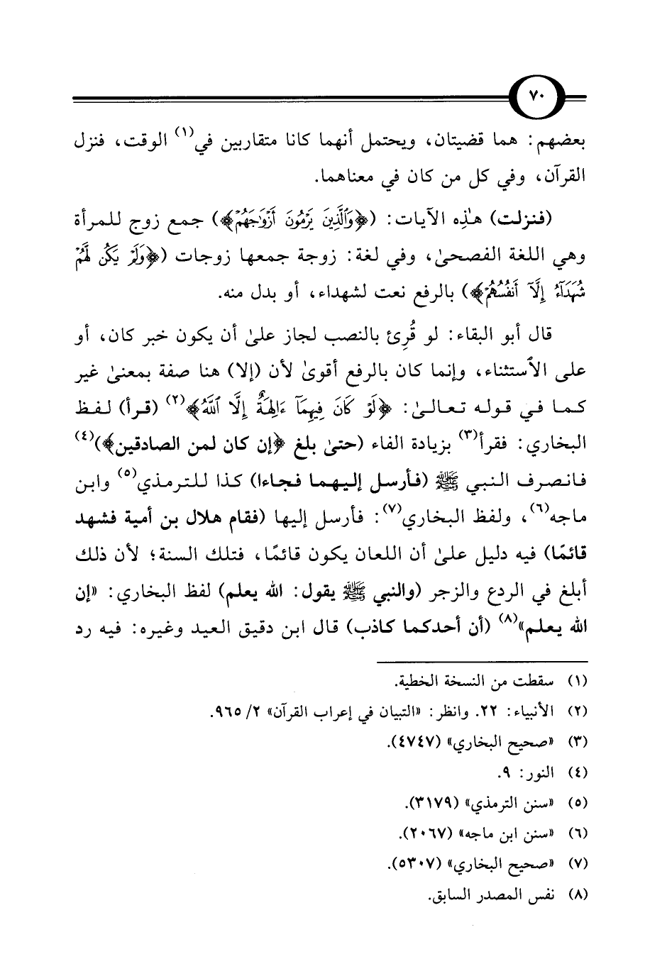 (فنزلت) هذِه الآيات: ({وَالَّذِينَ يَرْمُونَ أَزْوَاجَهُمْ}) جمع زوج للمرأة وهي اللغة الفصحى، وفي لغة: زوجة جمعها زوجات {وَلَمْ يَكُنْ لَهُمْ شُهَدَاءُ إِلَّا أَنْفُسُهُمْ}) بالرفع نعت لشهداء، أو بدل منه.