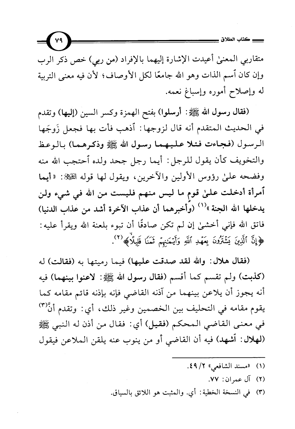 (فقال رسول الله - صلى الله عليه وسلم -: أرسلوا) بفتح الهمزة وكسر السين (إليها) وتقدم في الحديث المتقدم أنه قال لزوجها: اذهب فأت بها فجعل زَوجَها الرسول (فجاءت فتلا عليهما رسول الله - صلى الله عليه وسلم - وذكرهما) بالوعظ والتخويف كأن يقول للرجل: أيما رجل جحد ولده احتجب الله منه وفضحه على رؤوس الأولين والآخرين، ويقول لها قوله - عليه السلام -: "أيما امرأة أدخلت على قومٍ ما ليس منهم فليست من الله في شيء ولن يدخلها الله الجنة" (¬1) (وأخبرهما أن عذاب الآخرة أشد من عذاب الدنيا) فاتق الله فإني أخشى إن لم تكن صادقًا أن تبوء بلعنة الله ويقرأ عليه: {إِنَّ الَّذِينَ يَشْتَرُونَ بِعَهْدِ اللَّهِ وَأَيْمَانِهِمْ ثَمَنًا قَلِيلًا} (¬2).