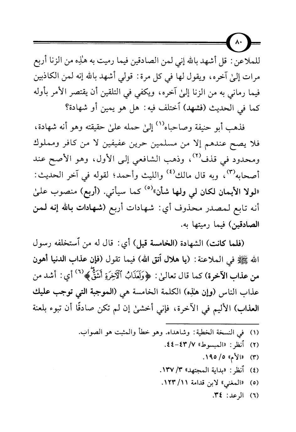 (فلما كانت) الشهادة (الخامسة قيل) أي: قال له من استخلفه رسول الله - صلى الله عليه وسلم - في الملاعنة: (يا هلال اتق الله) فيما تقول (فإن عذاب الدنيا أهون من عذاب الآخرة) كما قال تعالى: {وَلَعَذَابُ الْآخِرَةِ أَشَقُّ} (¬6) أي: أشد من عذاب الناس (وإن هذِه) الكلمة الخامسة هي (الموجبة التي توجب عليك العذاب) الأليم في الآخرة، فإني أخشى إن لم تكن صادقًا أن تبوء بلعنة