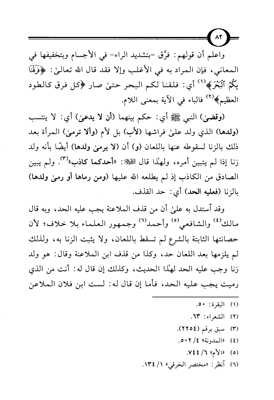 (وقضى) النبي - صلى الله عليه وسلم - أي: حكم بينهما (أن لا يدعى) أي: لا ينتسب (ولدها) الذي ولد على فراشها (لأب) بل لأم (وألا ترمى) المرأة بعد ذلك بالزنا لسقوطه عنها باللعان (و) أن (لا يرمى ولدها) أيضًا بأنه ولد زنا إذا لم يتبين أمره، ولهذا قال - عليه السلام -: "أحدكما كاذب" (¬3). ولم يبين الصادق من الكاذب إذ لم يطلعه الله عليها (ومن رماها أو رمى ولدها) بالزنا (فعليه الحد) أي: حد القذف.